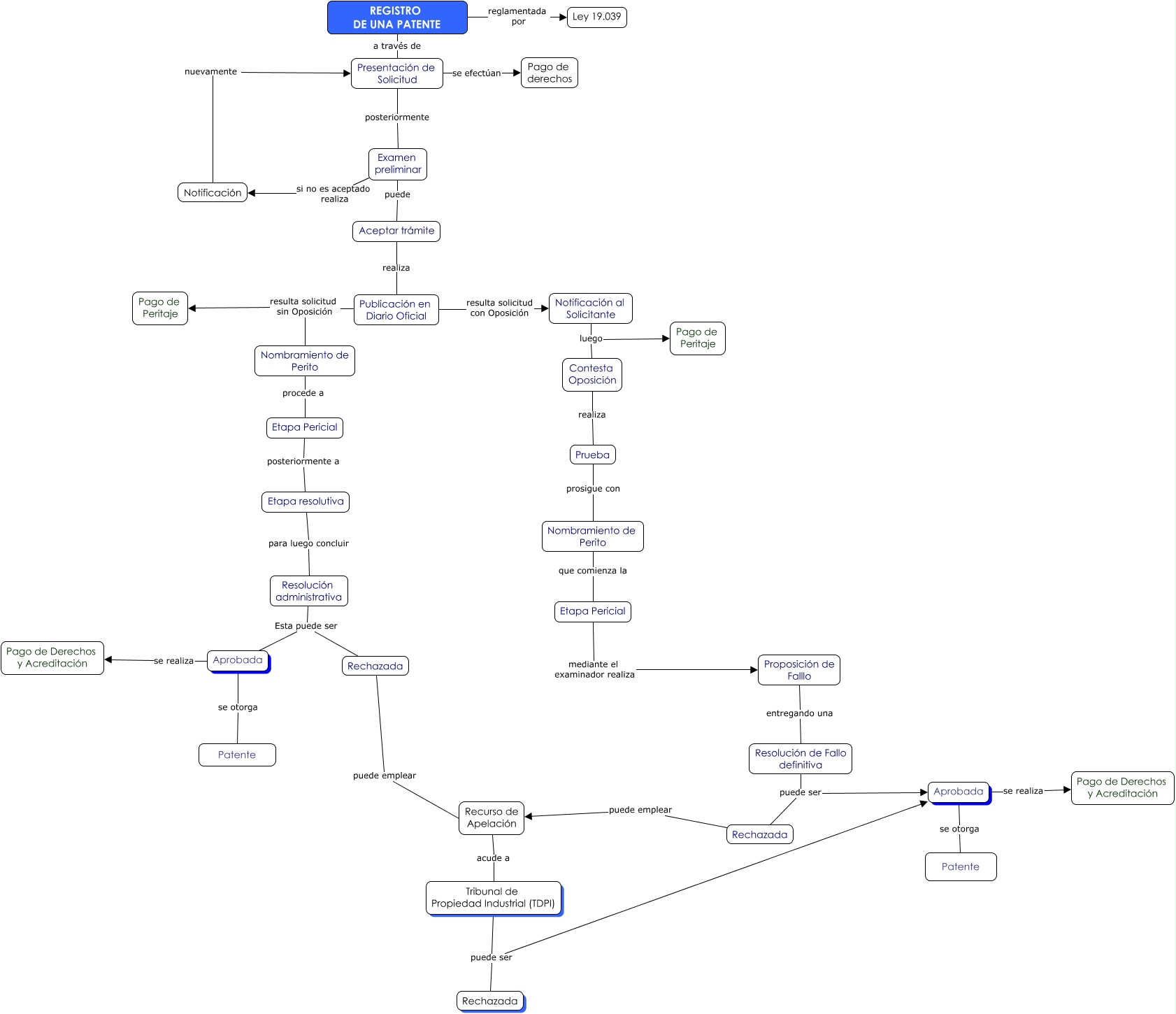 Este Cmap, tiene información relacionada con: Genesis Rojas. Registro de una patente, Tribunal de Propiedad Industrial (TDPI) puede ser Rechazada, Aprobada se otorga Patente, Examen preliminar puede Aceptar trámite, Presentación de Solicitud se efectúan Pago de derechos, Notificación nuevamente Presentación de Solicitud, Recurso de Apelación acude a Tribunal de Propiedad Industrial (TDPI), Prueba prosigue con Nombramiento de Perito, Notificación al Solicitante luego Contesta Oposición, Tribunal de Propiedad Industrial (TDPI) puede ser Aprobada, REGISTRO DE UNA PATENTE a través de Presentación de Solicitud, Contesta Oposición realiza Prueba, Etapa Pericial posteriormente a Etapa resolutiva, Nombramiento de Perito que comienza la Etapa Pericial, Aceptar trámite realiza Publicación en Diario Oficial, REGISTRO DE UNA PATENTE reglamentada por Ley 19.039, Resolución administrativa Esta puede ser Aprobada, Aprobada se otorga Patente, Resolución de Fallo definitiva puede ser Rechazada, Publicación en Diario Oficial resulta solicitud sin Oposición Nombramiento de Perito, Presentación de Solicitud posteriormente Examen preliminar