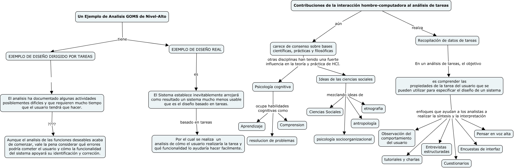 Este Cmap, tiene información relacionada con: Berlanga-ultima parte, Psicología cognitiva ocupa habilidades cognitivas como Aprendizaje, es comprender las propiedades de la tarea del usuario que se pueden utilizar para especificar el diseño de un sistema enfoques que ayudan a los analistas a realizar la síntesis y la interpretación Pensar en voz alta, carece de consenso sobre bases científicas, prácticas y filosóficas otras disciplinas han tenido una fuerte influencia en la teoría y práctica de HCI. Ideas de las ciencias sociales, es comprender las propiedades de la tarea del usuario que se pueden utilizar para especificar el diseño de un sistema enfoques que ayudan a los analistas a realizar la síntesis y la interpretación Cuestionarios, EJEMPLO DE DISEÑO REAL es El Sistema establece inevitablemente arrojará como resultado un sistema mucho menos usable que es el diseño basado en tareas., Psicología cognitiva ocupa habilidades cognitivas como resolucion de problemas, Psicología cognitiva ocupa habilidades cognitivas como Comprension, El Sistema establece inevitablemente arrojará como resultado un sistema mucho menos usable que es el diseño basado en tareas. basado en tareas Por el cual se realiza un analisis de cómo el usuario realizaría la tarea y qué funcionalidad lo ayudaría hacer facilmente., es comprender las propiedades de la tarea del usuario que se pueden utilizar para especificar el diseño de un sistema enfoques que ayudan a los analistas a realizar la síntesis y la interpretación Entrevistas estructuradas, es comprender las propiedades de la tarea del usuario que se pueden utilizar para especificar el diseño de un sistema enfoques que ayudan a los analistas a realizar la síntesis y la interpretación tutoriales y charlas, es comprender las propiedades de la tarea del usuario que se pueden utilizar para especificar el diseño de un sistema enfoques que ayudan a los analistas a realizar la síntesis y la interpretación Observación del comportamiento del usuario, EJEMPLO DE DISEÑO DIRIGIDO POR TAREAS El analisis ha documentado algunas actividades posiblementes dificles y que requieren mucho tiempo que el usuario tendrá que hacer., es comprender las propiedades de la tarea del usuario que se pueden utilizar para especificar el diseño de un sistema enfoques que ayudan a los analistas a realizar la síntesis y la interpretación Encuestas de interfaz, Ideas de las ciencias sociales mezclando ideas de etnografia, Ideas de las ciencias sociales mezclando ideas de antropología, El analisis ha documentado algunas actividades posiblementes dificles y que requieren mucho tiempo que el usuario tendrá que hacer. ???? Aunque el analisis de las funciones deseables acaba de comenzar, vale la pena considerar qué errores podría cometer el usuario y cómo la funcionalidad del sistema apoyará su identificación y correción., Ideas de las ciencias sociales mezclando ideas de psicología socioorganizacional, Un Ejemplo de Analisis GOMS de Nivel-Alto tiene EJEMPLO DE DISEÑO REAL, carece de consenso sobre bases científicas, prácticas y filosóficas otras disciplinas han tenido una fuerte influencia en la teoría y práctica de HCI. Psicología cognitiva, Ideas de las ciencias sociales mezclando ideas de Ciencias Sociales