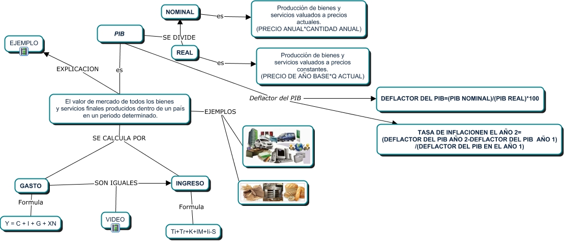 Este Cmap, tiene información relacionada con: PIB, El valor de mercado de todos los bienes y servicios finales producidos dentro de un país en un periodo determinado. EXPLICACION EJEMPLO, PIB Deflactor del PIB TASA DE INFLACIONEN EL AÑO 2= (DEFLACTOR DEL PIB AÑO 2-DEFLACTOR DEL PIB AÑO 1) /(DEFLACTOR DEL PIB EN EL AÑO 1), GASTO SON IGUALES INGRESO, PIB SE DIVIDE NOMINAL, PIB SE DIVIDE REAL, El valor de mercado de todos los bienes y servicios finales producidos dentro de un país en un periodo determinado. EJEMPLOS, GASTO Formula Y = C + I + G + XN, GASTO SON IGUALES VIDEO, REAL es Producción de bienes y servicios valuados a precios constantes. (PRECIO DE AÑO BASE*Q ACTUAL), El valor de mercado de todos los bienes y servicios finales producidos dentro de un país en un periodo determinado. SE CALCULA POR INGRESO, El valor de mercado de todos los bienes y servicios finales producidos dentro de un país en un periodo determinado. EJEMPLOS, PIB Deflactor del PIB DEFLACTOR DEL PIB=(PIB NOMINAL)/(PIB REAL)*100, NOMINAL es Producción de bienes y servicios valuados a precios actuales. (PRECIO ANUAL*CANTIDAD ANUAL), El valor de mercado de todos los bienes y servicios finales producidos dentro de un país en un periodo determinado. SE CALCULA POR GASTO, INGRESO Formula Ti+Tr+K+IM+Ii-S, PIB es El valor de mercado de todos los bienes y servicios finales producidos dentro de un país en un periodo determinado.
