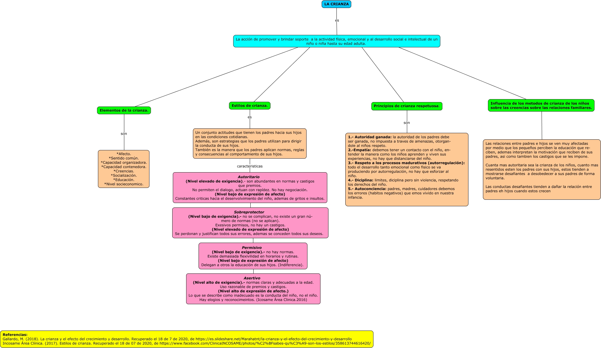 Este Cmap, tiene información relacionada con: Mapa conceptual. La crianza, Permisivo (Nivel bajo de exigencia).- no hay normas. Existe demasiada flexivilidad en horarios y rutinas. (Nivel bajo de expresión de afecto) Delegan a otros la educación de sus hijos. (Indiferencia). ???? Asertivo (Nivel alto de exigencia).- normas claras y adecuadas a la edad. Uso razonable de premios y castigos. (Nivel alto de expresión de afecto.) Lo que se describe como inadecuado es la conducta del niño, no el niño. Hay elogios y reconocimeintos. (Icosame Área Clinica.2016), La acción de promover y brindar soporte a la actividad física, emocional y al desarrollo social e intelectual de un niño o niña hasta su edad adulta. ???? Influencia de los metodos de crianza de los niños sobre las creencias sobre las relaciones familiares., Influencia de los metodos de crianza de los niños sobre las creencias sobre las relaciones familiares. ???? Las relaciones entre padres e hijos se ven muy afectadas por medio que los pequeños perciben la educación que re- ciben, ademas interpretan la motivación que reciben de sus padres, asi como tambien los castigos que se les impone. Cuanta mas autoritaria sea la crianza de los niños, cuanto mas resentidos esten los padres con sus hijos, estos tienden a mostrarse desafiantes a desobedecer a sus padres de forma voluntaria. Las conductas desafiantes tienden a dañar la relación entre padres eh hijos cuando estos crecen, Un conjunto actitudes que tienen los padres hacia sus hijos en las condiciones cotidianas. Además, son estrategias que los padres utilizan para dirigir la conducta de sus hijos. También es la manera que los padres aplican normas, reglas y consecuencias al comportamiento de sus hijos. caracteristicas Autoritario (Nivel elevado de exigencia).- son abundantes en normas y castigos que premios. No permiten el dialogo, actuan con rapídez. No hay negociación. (Nivel bajo de expresión de afecto) Constantes criticas hacia el desenvolvimiento del niño, ademas de gritos e insultos., Principios de crianza respetuosa. son 1.- Autoridad ganada: la autoridad de los padres debe ser ganada, no impuesta a traves de amenazas, otorgan- dole al niños respeto. 2.-Empatía: debemos tener un contacto con el niño, en- tender la manera como los niños aprenden y viven sus experiencias, no hay que distanciarse del niño. 3.- Respeto a los procesos madurativos (autorregulación): todo el desarrollo tanto emocional como fisico se va produciendo por autorregulación, no hay que esforzar al niño. 4.- Diciplina: limites, diciplina pero sin violencia, respetando los derechos del niño. 5.- Autoconciencia: padres, madres, cuidadores debemos los errores (habitos negativos) que emos vivido en nuestra infancia., La acción de promover y brindar soporte a la actividad física, emocional y al desarrollo social e intelectual de un niño o niña hasta su edad adulta. estilos Estilos de crianza., Estilos de crianza. es Un conjunto actitudes que tienen los padres hacia sus hijos en las condiciones cotidianas. Además, son estrategias que los padres utilizan para dirigir la conducta de sus hijos. También es la manera que los padres aplican normas, reglas y consecuencias al comportamiento de sus hijos., La acción de promover y brindar soporte a la actividad física, emocional y al desarrollo social e intelectual de un niño o niña hasta su edad adulta. ???? Elementos de la crianza., Elementos de la crianza. son *Afecto. *Sentido común. *Capacidad organizadora. *Capacidad contenedora. *Creencias. *Socialización. *Educación. *Nivel socieconomico., LA CRIANZA es La acción de promover y brindar soporte a la actividad física, emocional y al desarrollo social e intelectual de un niño o niña hasta su edad adulta., La acción de promover y brindar soporte a la actividad física, emocional y al desarrollo social e intelectual de un niño o niña hasta su edad adulta. ???? Principios de crianza respetuosa., Autoritario (Nivel elevado de exigencia).- son abundantes en normas y castigos que premios. No permiten el dialogo, actuan con rapídez. No hay negociación. (Nivel bajo de expresión de afecto) Constantes criticas hacia el desenvolvimiento del niño, ademas de gritos e insultos. ???? Sobreprotector (Nivel bajo de exigencia).- no se complican, no existe un gran nú- mero de normas (no se aplican). Exesivos permisos, no hay un castigos. (Nivel elevado de expresión de afecto) Se perdonan y justifican todos sus errores, ademas se conceden todos sus deseos., Sobreprotector (Nivel bajo de exigencia).- no se complican, no existe un gran nú- mero de normas (no se aplican). Exesivos permisos, no hay un castigos. (Nivel elevado de expresión de afecto) Se perdonan y justifican todos sus errores, ademas se conceden todos sus deseos. ???? Permisivo (Nivel bajo de exigencia).- no hay normas. Existe demasiada flexivilidad en horarios y rutinas. (Nivel bajo de expresión de afecto) Delegan a otros la educación de sus hijos. (Indiferencia).