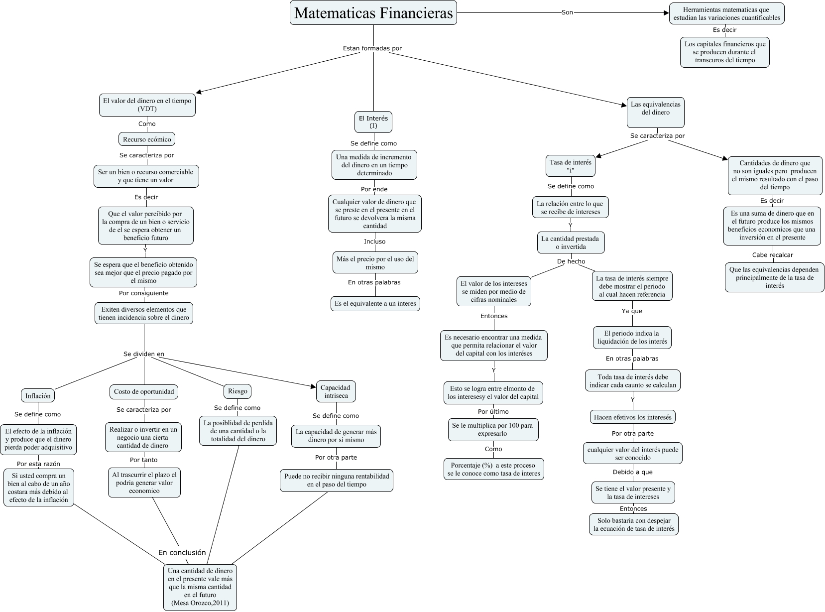 Este Cmap, tiene información relacionada con: Matematicas financiera, Inflación Se define como El efecto de la inflación y produce que el dinero pierda poder adquisitivo, Las equivalencias del dinero Se caracteriza por Cantidades de dinero que no son iguales pero producen el mismo resultado con el paso del tiempo, Exiten diversos elementos que tienen incidencia sobre el dinero Se dividen en Inflación, Herramientas matematicas que estudian las variaciones cuantificables Es decir Los capitales financieros que se producen durante el transcuros del tiempo, Una cantidad de dinero en el presente vale más que la misma cantidad en el futuro (Mesa Orozco,2011) ???? Si usted compra un bien al cabo de un año costara más debido al efecto de la inflación, cualquier valor del interés puede ser conocido Debido a que Se tiene el valor presente y la tasa de intereses, Exiten diversos elementos que tienen incidencia sobre el dinero Se dividen en Riesgo, La tasa de interés siempre debe mostrar el periodo al cual hacen referencia Ya que El periodo indica la liquidación de los interés, Tasa de interés "i" Se define como La relación entre lo que se recibe de intereses, Cantidades de dinero que no son iguales pero producen el mismo resultado con el paso del tiempo Es decir Es una suma de dinero que en el futuro produce los mismos beneficios economicos que una inversión en el presente, Riesgo Se define como La posiblidad de perdida de una cantidad o la totalidad del dinero, El efecto de la inflación y produce que el dinero pierda poder adquisitivo Por esta razón Si usted compra un bien al cabo de un año costara más debido al efecto de la inflación, La cantidad prestada o invertida De hecho El valor de los intereses se miden por medio de cifras nominales, Exiten diversos elementos que tienen incidencia sobre el dinero Se dividen en Capacidad intriseca, Una cantidad de dinero en el presente vale más que la misma cantidad en el futuro (Mesa Orozco,2011) ???? La posiblidad de perdida de una cantidad o la totalidad del dinero, La relación entre lo que se recibe de intereses Y La cantidad prestada o invertida, Costo de oportunidad Se caracteriza por Realizar o invertir en un negocio una cierta cantidad de dinero, Exiten diversos elementos que tienen incidencia sobre el dinero Se dividen en Costo de oportunidad, El Interés (I) Se define como Una medida de incremento del dinero en un tiempo determinado, Hacen efetivos los interesés Por otra parte cualquier valor del interés puede ser conocido