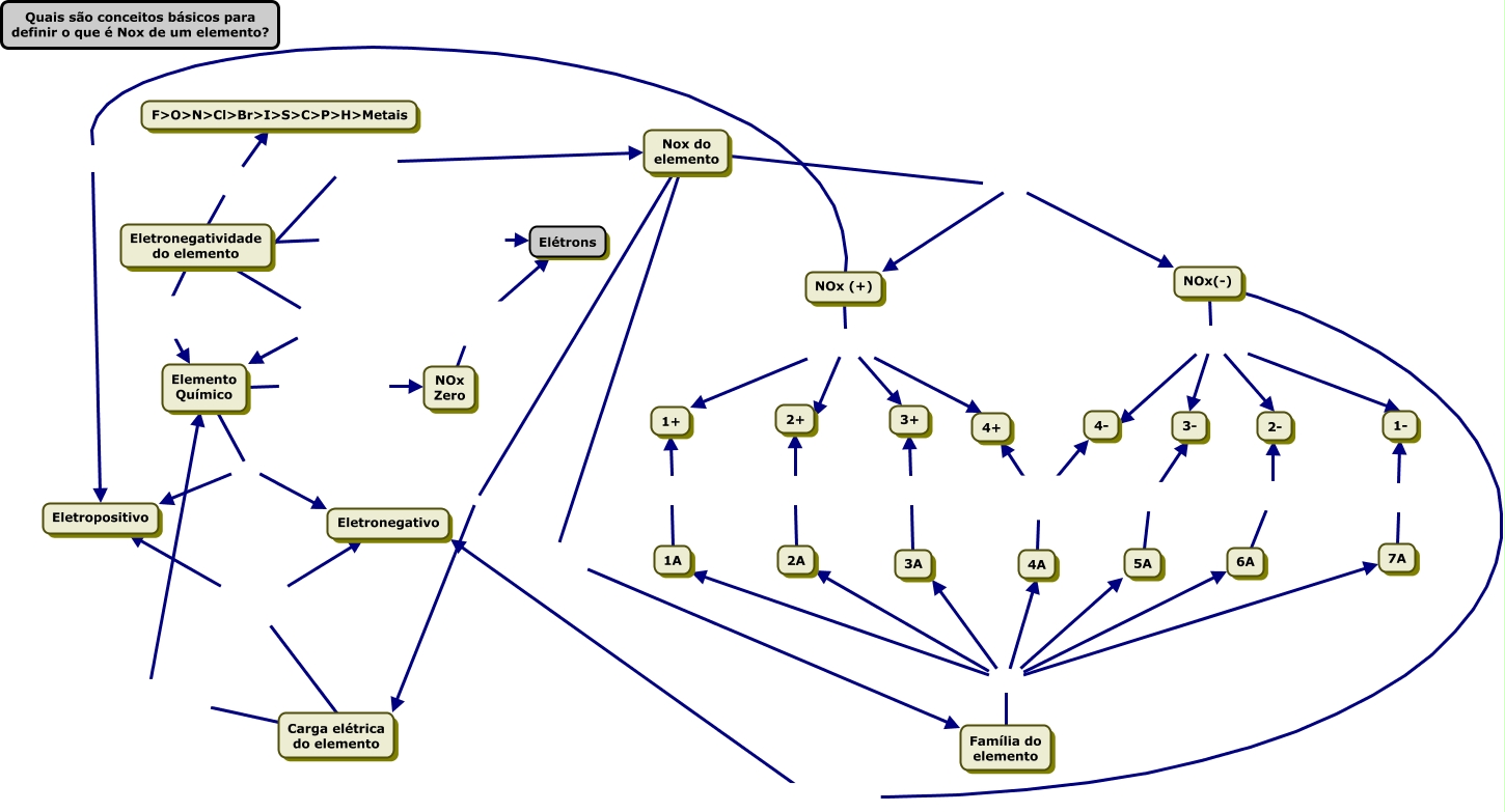 Esse mapa conceitual, produzido no IHMC CmapTools, tem a informação relacionada a: Como determinar o NOx de um elemento químico num composto Link Bco, NOx(-) podem ter carga 3-, Eletronegatividade do elemento é capacidade de atrair elétrons de outro Elemento Químico, NOx(-) podem ter carga 2-, NOx Zero significa que não houve perda ou ganho de Elétrons, Família do elemento pode ser 1A, Família do elemento pode ser 4A, Elemento Químico pode ser Eletronegativo, Carga elétrica do elemento depende das interações feitas com outro Elemento Químico, NOx (+) podem ter carga 4+, NOx (+) podem ter carga 3+, Elemento Químico em substâncias simples têm NOx Zero, NOx(-) ocorre no elemento mais Eletronegativo, Carga elétrica do elemento mostra se o elemento é mais Eletropositivo, Nox do elemento está relacionado com a Família do elemento, 7A tem elementos com carga 1-, NOx (+) ocorre no elemento mais Eletropositivo, 5A tem elementos com carga 3-, NOx(-) podem ter carga 1-, NOx (+) podem ter carga 2+, Família do elemento pode ser 5A