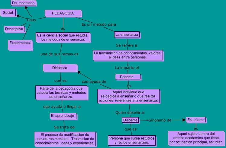 Este Cmap, tiene información relacionada con: MapaCoceptualLauraCampos, PEDAGOGIA Tipos Social, PEDAGOGIA Es un metodo para La enseñanza, Parte de la pedagogia que estudia las tecnicas y metodos de enseñanza. que ayuda a llegar a El aprendizaje, Aquel individuo que se dedica a enseñar o que realiza acciones referentes a la enseñanza. con ayuda de Didactica, El aprendizaje Se trata de El proceso de modificacion de estructuras mentales. Trasmicion de conocimientos, ideas y experiencias., PEDAGOGIA Tipos Descriptiva, La enseñanza Se refiere a La transmicion de conocimientos, valores e ideas entre personas., Aquel individuo que se dedica a enseñar o que realiza acciones referentes a la enseñanza. Quien enseña al Discente, La transmicion de conocimientos, valores e ideas entre personas. La imparte el Docente, Didactica que es Parte de la pedagogia que estudia las tecnicas y metodos de enseñanza., PEDAGOGIA Tipos Experimental, PEDAGOGIA es Es la ciencia social que estudia los metodos de enseñanza., Estudiante es Aquel sujeto dentro del ambito academico que tiene por ocupacion principal, estudiar., Discente que es Persona que cursa estudios y recibe enseñanzas., Discente Sinonimo de Estudiante, Docente Es Aquel individuo que se dedica a enseñar o que realiza acciones referentes a la enseñanza., Es la ciencia social que estudia los metodos de enseñanza. una de sus ramas es Didactica, PEDAGOGIA Tipos Del modelado