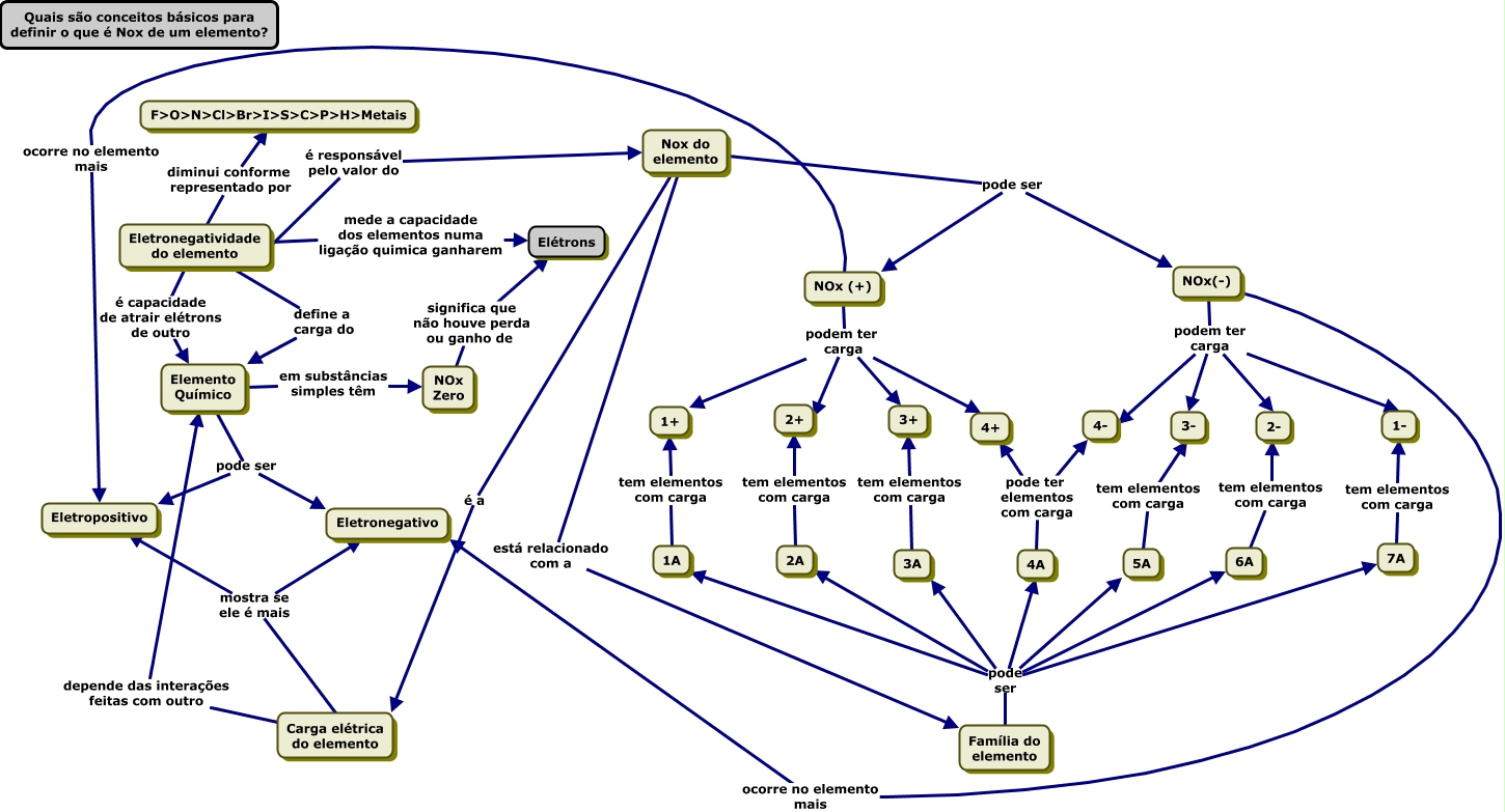 Esse mapa conceitual, produzido no IHMC CmapTools, tem a informação relacionada a: Quais são conceitos básicos para definir o que é Nox de um elemento, 7A tem elementos com carga 1-, Eletronegatividade do elemento é responsável pelo valor do Nox do elemento, 4A pode ter elementos com carga 4+, NOx(-) podem ter carga 2-, NOx(-) podem ter carga 1-, NOx Zero significa que não houve perda ou ganho de Elétrons, Nox do elemento pode ser NOx(-), NOx (+) podem ter carga 4+, Nox do elemento é a Carga elétrica do elemento, NOx(-) podem ter carga 4-, 1A tem elementos com carga 1+, Família do elemento pode ser 2A, Família do elemento pode ser 7A, 3A tem elementos com carga 3+, 5A tem elementos com carga 3-, NOx (+) podem ter carga 3+, Nox do elemento está relacionado com a Família do elemento, Eletronegatividade do elemento mede a capacidade dos elementos numa ligação quimica ganharem Elétrons, 4A pode ter elementos com carga 4-, NOx(-) podem ter carga 3-