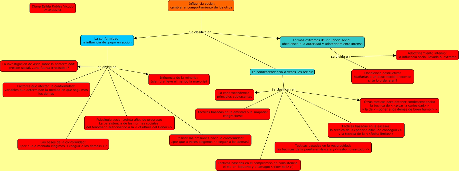 Este Cmap, tiene información relacionada con: La influencia social, Influencia social: cambiar el comportamiento de los otros Se clasifica en La conformidad: la influencia de grupo en accion, La condescendencia-a veces- es recibir Se clasifican en Tacticas basadas en la amistad o la simpatia: congraciarse, La conformidad: la influencia de grupo en accion se divide en La investigacion de Asch sobre la conformidad: presion social, ¿una fuerza irresistible?, La conformidad: la influencia de grupo en accion se divide en Las bases de la conformidad: ¿por que a menudo elegimos <<seguir a los demas>>?, La conformidad: la influencia de grupo en accion se divide en Resistir las presiones hacia la conformidad: ¿por que a veces elegimos no seguir a los demas?, La conformidad: la influencia de grupo en accion se divide en Influencia de la minoria: ¿siempre lleve el mando la mayoria?, La conformidad: la influencia de grupo en accion se divide en Factores que afectan la conformidad: variables que determinan la medida en que seguimos los demas, La condescendencia-a veces- es recibir Se clasifican en Otras tacticas para obtener condescendencia: la tecnica de <<picar la curiosidad>> y la de <<poner a los demas de buen humor>>, La condescendencia-a veces- es recibir Se clasifican en Tacticas basadas en la escasez: la tecnica de <<ponerlo dificil de conseguir>> y la tecnica de la <<fecha limite>>, Formas extremas de influencia social: obediencia a la autoridad y adoctrinamiento intenso se divide en Adoctrinamiento intenso: la influencia social llevada al extremo, La conformidad: la influencia de grupo en accion se divide en Psicologia social:treinta años de pregreso: La persistencia de las normas sociales: del fenomeno autocinetico a la <<Cultura del Honor>>, La condescendencia-a veces- es recibir Se clasifican en La condescendencia: principios subyacentes, La condescendencia-a veces- es recibir Se clasifican en Tacticas basadas en la reciprocidad: las tecnicas de la puerta-en-la-cara y<<esto-no-es-todo>>, Influencia social: cambiar el comportamiento de los otros Se clasifica en La condescendencia-a veces- es recibir, La condescendencia-a veces- es recibir Se clasifican en Tacticas basadas en el compromiso de consistencia: el pie-en-lapuerta y el amago(<<low ball>>), Formas extremas de influencia social: obediencia a la autoridad y adoctrinamiento intenso se divide en Obediencia destructiva: ¿dañarias a un desconocido inocente si te lo ordenaran?, Influencia social: cambiar el comportamiento de los otros Se clasifica en Formas extremas de influencia social: obediencia a la autoridad y adoctrinamiento intenso