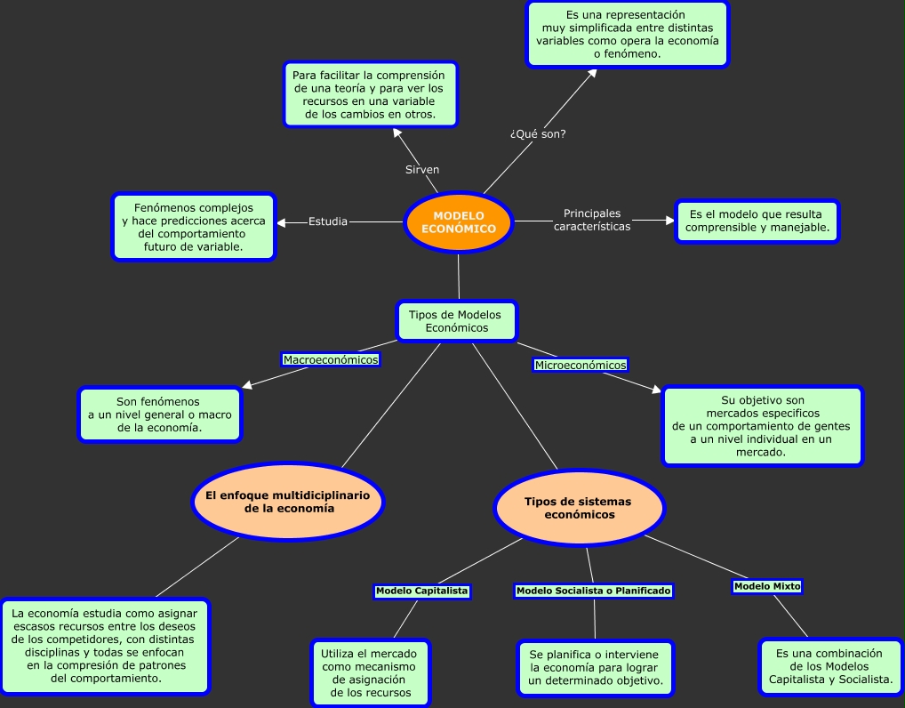 Este Cmap, tiene información relacionada con: Modelo Economico25, MODELO ECONÓMICO ¿Qué son? Es una representación muy simplificada entre distintas variables como opera la economía o fenómeno., MODELO ECONÓMICO ???? Tipos de Modelos Económicos, MODELO ECONÓMICO Sirven Para facilitar la comprensión de una teoría y para ver los recursos en una variable de los cambios en otros., El enfoque multidiciplinario de la economía ???? La economía estudia como asignar escasos recursos entre los deseos de los competidores, con distintas disciplinas y todas se enfocan en la compresión de patrones del comportamiento., MODELO ECONÓMICO Estudia Fenómenos complejos y hace predicciones acerca del comportamiento futuro de variable., Tipos de Modelos Económicos Microeconómicos Su objetivo son mercados especificos de un comportamiento de gentes a un nivel individual en un mercado., Tipos de Modelos Económicos Macroeconómicos Son fenómenos a un nivel general o macro de la economía., Tipos de Modelos Económicos ???? Tipos de sistemas económicos, Tipos de sistemas económicos Modelo Socialista o Planificado Se planifica o interviene la economía para lograr un determinado objetivo., Tipos de sistemas económicos Modelo Mixto Es una combinación de los Modelos Capitalista y Socialista., MODELO ECONÓMICO Principales características Es el modelo que resulta comprensible y manejable., Tipos de sistemas económicos Modelo Capitalista Utiliza el mercado como mecanismo de asignación de los recursos, Tipos de Modelos Económicos ???? El enfoque multidiciplinario de la economía