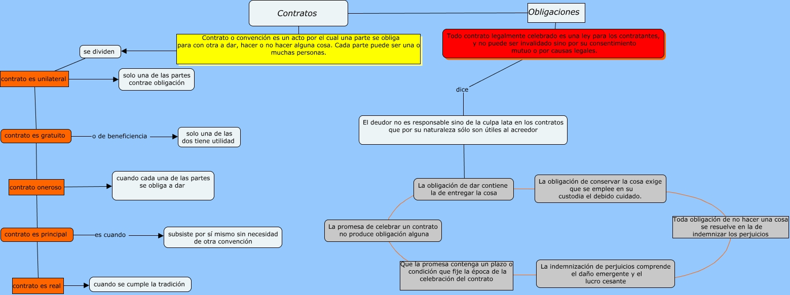 Este Cmap, tiene información relacionada con: contratos y obligaciones, contrato es gratuito contrato oneroso cuando cada una de las partes se obliga a dar, contrato es gratuito o de beneficiencia solo una de las dos tiene utilidad, Contratos Contrato o convención es un acto por el cual una parte se obliga para con otra a dar, hacer o no hacer alguna cosa. Cada parte puede ser una o muchas personas. se dividen, Todo contrato legalmente celebrado es una ley para los contratantes, y no puede ser invalidado sino por su consentimiento mutuo o por causas legales. dice El deudor no es responsable sino de la culpa lata en los contratos que por su naturaleza sólo son útiles al acreedor, La obligación de conservar la cosa exige que se emplee en su custodia el debido cuidado. La promesa de celebrar un contrato no produce obligación alguna, contrato es principal es cuando subsiste por sí mismo sin necesidad de otra convención, se dividen contrato es unilateral solo una de las partes contrae obligación, Contratos Obligaciones Todo contrato legalmente celebrado es una ley para los contratantes, y no puede ser invalidado sino por su consentimiento mutuo o por causas legales., contrato es principal contrato es real cuando se cumple la tradición, contrato es gratuito contrato oneroso contrato es principal, El deudor no es responsable sino de la culpa lata en los contratos que por su naturaleza sólo son útiles al acreedor La promesa de celebrar un contrato no produce obligación alguna, se dividen contrato es unilateral contrato es gratuito