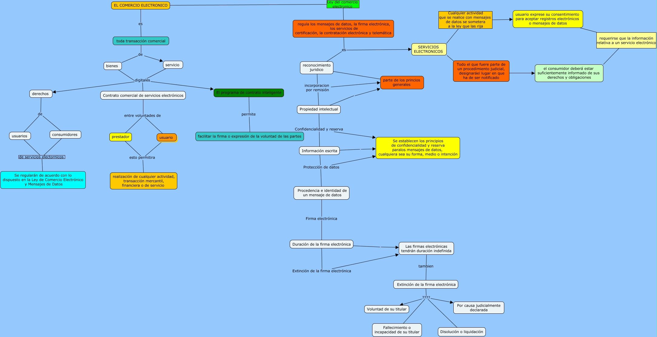 Este Cmap, tiene información relacionada con: Comercio electronico, Procedencia e identidad de un mensaje de datos Firma electrónica Duración de la firma electrónica, Propiedad intelectual Confidencialidad y reserva Se establecen los principios de confidencialidad y reserva paralos mensajes de datos, cualquiera sea su forma, medio o intención, Contrato comercial de servicios electrónicos entre voluntades de prestador, toda transacción comercial de bienes, bienes digitales Contrato comercial de servicios electrónicos, SERVICIOS ELECTRONICOS Cualquier actividad que se realice con mensajes de datos se sometera a la ley que las rija usuario exprese su consentimiento para aceptar registros electrónicos o mensajes de datos, Contrato comercial de servicios electrónicos entre voluntades de usuario, regula los mensajes de datos, la firma electrónica, los servicios de certificación, la contratación electrónica y telemática es SERVICIOS ELECTRONICOS, consumidores de servicios electornicos Se regularán de acuerdo con lo dispuesto en la Ley de Comercio Electrónico y Mensajes de Datos, Extinción de la firma electrónica ???? Fallecimiento o incapacidad de su titular, derechos de usuarios, reconocimiento juridico incorporacion por remisión parte de los princios generales, Extinción de la firma electrónica ???? Por causa judicialmente declarada, servicio digitales Contrato comercial de servicios electrónicos, Extinción de la firma electrónica ???? Disolución o liquidación, servicio digitales El programa de contrato inteligente, El programa de contrato inteligente permite facilitar la firma o expresión de la voluntad de las partes, Información escrita Protección de datos Procedencia e identidad de un mensaje de datos, usuario exprese su consentimiento para aceptar registros electrónicos o mensajes de datos requerirse que la información relativa a un servicio electrónico el consumidor deberá estar suficientemente informado de sus derechos y obligaciones, EL COMERCIO ELECTRONICO es toda transacción comercial
