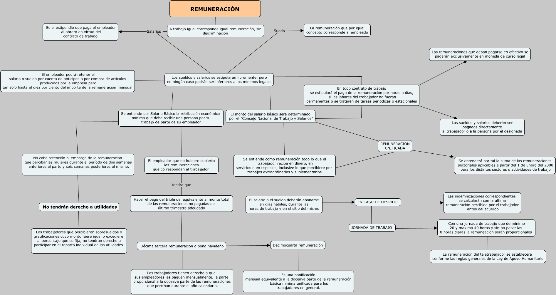 Este Cmap, tiene información relacionada con: Remuneración, No tendrán derecho a utilidades ???? Los trabajadores que percibieren sobresueldos o gratificaciones cuyo monto fuere igual o excediere al porcentaje que se fija, no tendrán derecho a participar en el reparto individual de las utilidades., El salario o el sueldo deberán abonarse en días hábiles, durante las horas de trabajo y en el sitio del mismo ???? EN CASO DE DESPIDO, A trabajo igual corresponde igual remuneración, sin discriminación Salarios Es el estipendio que paga el empleador al obrero en virtud del contrato de trabajo, Con una jornada de trabajo que de minimo 20 y maximo 40 horas y sin no pasar las 8 horas diaras la remuneacion serán proporcionales ???? La remuneración del teletrabajador se establecerá conforme las reglas generales de la Ley de Apoyo Humanitario, El empleador que no hubiere cubierto las remuneraciones que correspondan al trabajador tendra que Hacer el pago del triple del equivalente al monto total de las remuneraciones no pagadas del último trimestre adeudado, Decimocuarta remuneración ???? Es una bonificación mensual equivalente a la doceava parte de la remuneración básica mínima unificada para los trabajadores en general., JORNADA DE TRABAJO ???? Con una jornada de trabajo que de minimo 20 y maximo 40 horas y sin no pasar las 8 horas diaras la remuneacion serán proporcionales, En todo contrato de trabajo se estipulará el pago de la remuneración por horas o días, si las labores del trabajador no fueran permanentes o se trataren de tareas periódicas o estacionales ???? Las remuneraciones que deban pagarse en efectivo se pagarán exclusivamente en moneda de curso legal, EN CASO DE DESPIDO ???? JORNADA DE TRABAJO, A trabajo igual corresponde igual remuneración, sin discriminación Suedo Los sueldos y salarios se estipularán libremente, pero en ningún caso podrán ser inferiores a los mínimos legales, Los sueldos y salarios se estipularán libremente, pero en ningún caso podrán ser inferiores a los mínimos legales ???? Se entiende por Salario Básico la retribución económica mínima que debe recibir una persona por su trabajo de parte de su empleador, EN CASO DE DESPIDO ???? Las indemnizaciones correspondientes se calcularán con la última remuneración percibida por el trabajador antes del acuerdo, Los sueldos y salarios se estipularán libremente, pero en ningún caso podrán ser inferiores a los mínimos legales ???? En todo contrato de trabajo se estipulará el pago de la remuneración por horas o días, si las labores del trabajador no fueran permanentes o se trataren de tareas periódicas o estacionales, REMUNERACIÓN ???? A trabajo igual corresponde igual remuneración, sin discriminación, El monto del salario básico será determinado por el "Consejo Nacional de Trabajo y Salarios" ???? Se entiende como remuneración todo lo que el trabajador reciba en dinero, en servicios o en especies, inclusive lo que percibiere por trabajos extraordinarios y suplementarios, Se entiende como remuneración todo lo que el trabajador reciba en dinero, en servicios o en especies, inclusive lo que percibiere por trabajos extraordinarios y suplementarios ???? El salario o el sueldo deberán abonarse en días hábiles, durante las horas de trabajo y en el sitio del mismo, A trabajo igual corresponde igual remuneración, sin discriminación Salarios Los sueldos y salarios se estipularán libremente, pero en ningún caso podrán ser inferiores a los mínimos legales, REMUNERACION UNIFICADA ???? Se entenderá por tal la suma de las remuneraciones sectoriales aplicables a partir del 1 de Enero del 2000 para los distintos sectores o actividades de trabajo, Se entiende por Salario Básico la retribución económica mínima que debe recibir una persona por su trabajo de parte de su empleador ???? No cabe retención ni embargo de la remuneración que percibanlas mujeres durante el período de dos semanas anteriores al parto y seis semanas posteriores al mismo., A trabajo igual corresponde igual remuneración, sin discriminación Suedo La remuneración que por igual concepto corresponde al empleado