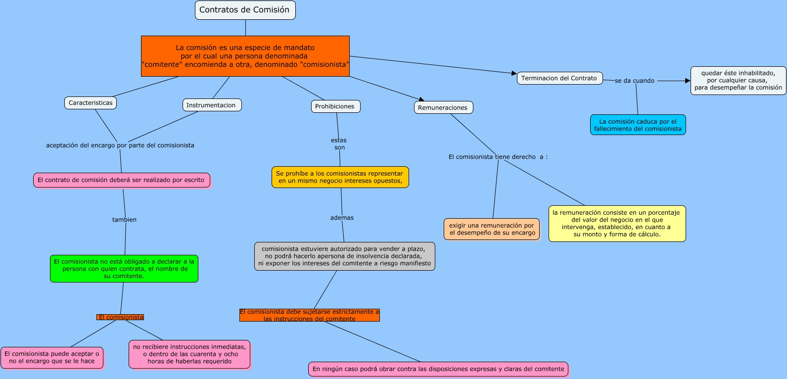 Este Cmap, tiene información relacionada con: Contratos de Comisión, Caracteristicas La comisión es una especie de mandato por el cual una persona denominada "comitente" encomienda a otra, denominado "comisionista" Remuneraciones, Prohibiciones estas son Se prohíbe a los comisionistas representar en un mismo negocio intereses opuestos,, El contrato de comisión deberá ser realizado por escrito tambien El comisionista no está obligado a declarar a la persona con quien contrata, el nombre de su comitente., Contratos de Comisión La comisión es una especie de mandato por el cual una persona denominada "comitente" encomienda a otra, denominado "comisionista" Prohibiciones, Caracteristicas aceptación del encargo por parte del comisionista El contrato de comisión deberá ser realizado por escrito, Contratos de Comisión La comisión es una especie de mandato por el cual una persona denominada "comitente" encomienda a otra, denominado "comisionista" Remuneraciones, Remuneraciones El comisionista tiene derecho a : la remuneración consiste en un porcentaje del valor del negocio en el que intervenga, establecido, en cuanto a su monto y forma de cálculo., Remuneraciones El comisionista tiene derecho a : exigir una remuneración por el desempeño de su encargo, Terminacion del Contrato se da cuando La comisión caduca por el fallecimiento del comisionista, Instrumentacion aceptación del encargo por parte del comisionista El contrato de comisión deberá ser realizado por escrito, El comisionista no está obligado a declarar a la persona con quien contrata, el nombre de su comitente. El comisionista El comisionista puede aceptar o no el encargo que se le hace, Terminacion del Contrato se da cuando quedar éste inhabilitado, por cualquier causa, para desempeñar la comisión, Contratos de Comisión La comisión es una especie de mandato por el cual una persona denominada "comitente" encomienda a otra, denominado "comisionista" Instrumentacion, El comisionista no está obligado a declarar a la persona con quien contrata, el nombre de su comitente. El comisionista no recibiere instrucciones inmediatas, o dentro de las cuarenta y ocho horas de haberlas requerido, Se prohíbe a los comisionistas representar en un mismo negocio intereses opuestos, ademas comisionista estuviere autorizado para vender a plazo, no podrá hacerlo apersona de insolvencia declarada, ni exponer los intereses del comitente a riesgo manifiesto, Caracteristicas La comisión es una especie de mandato por el cual una persona denominada "comitente" encomienda a otra, denominado "comisionista" Prohibiciones, Caracteristicas La comisión es una especie de mandato por el cual una persona denominada "comitente" encomienda a otra, denominado "comisionista" Terminacion del Contrato, Contratos de Comisión La comisión es una especie de mandato por el cual una persona denominada "comitente" encomienda a otra, denominado "comisionista" Terminacion del Contrato, Caracteristicas La comisión es una especie de mandato por el cual una persona denominada "comitente" encomienda a otra, denominado "comisionista" Instrumentacion, comisionista estuviere autorizado para vender a plazo, no podrá hacerlo apersona de insolvencia declarada, ni exponer los intereses del comitente a riesgo manifiesto El comisionista debe sujetarse estrictamente a las instrucciones del comitente En ningún caso podrá obrar contra las disposiciones expresas y claras del comitente
