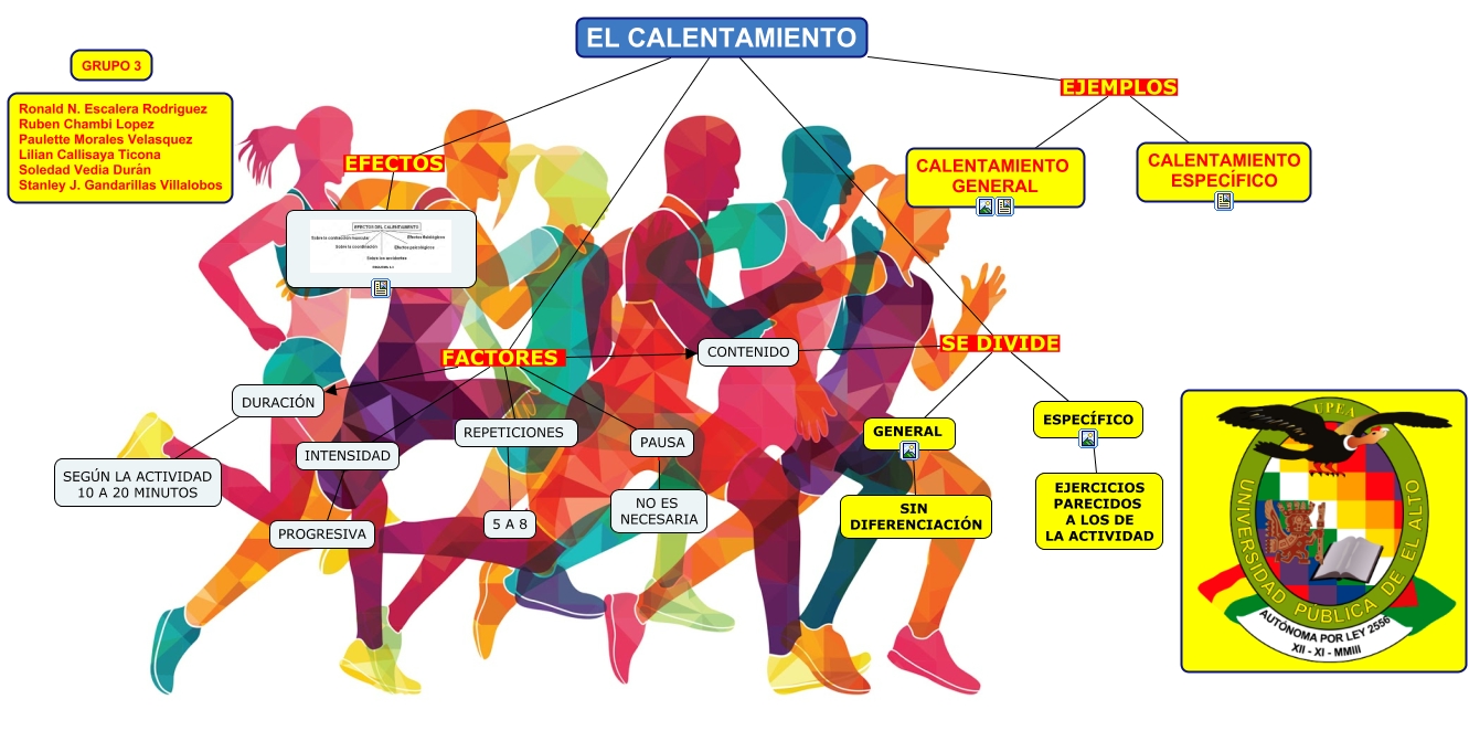Este Cmap, tiene información relacionada con: TRABAJO GRUPAL EL CALENTAMIENTO, DURACIÓN SEGÚN LA ACTIVIDAD 10 A 20 MINUTOS, EL CALENTAMIENTO FACTORES DURACIÓN, PAUSA NO ES NECESARIA, EL CALENTAMIENTO SE DIVIDE GENERAL, EL CALENTAMIENTO EJEMPLOS CALENTAMIENTO ESPECÍFICO, CONTENIDO SE DIVIDE ESPECÍFICO, INTENSIDAD ???? PROGRESIVA, REPETICIONES 5 A 8, EL CALENTAMIENTO FACTORES INTENSIDAD, GENERAL ???? SIN DIFERENCIACIÓN, ESPECÍFICO ???? EJERCICIOS PARECIDOS A LOS DE LA ACTIVIDAD, CONTENIDO SE DIVIDE GENERAL, EL CALENTAMIENTO FACTORES PAUSA, EL CALENTAMIENTO EJEMPLOS CALENTAMIENTO GENERAL, EL CALENTAMIENTO SE DIVIDE ESPECÍFICO, EL CALENTAMIENTO FACTORES CONTENIDO, EL CALENTAMIENTO FACTORES REPETICIONES, EL CALENTAMIENTO EFECTOS