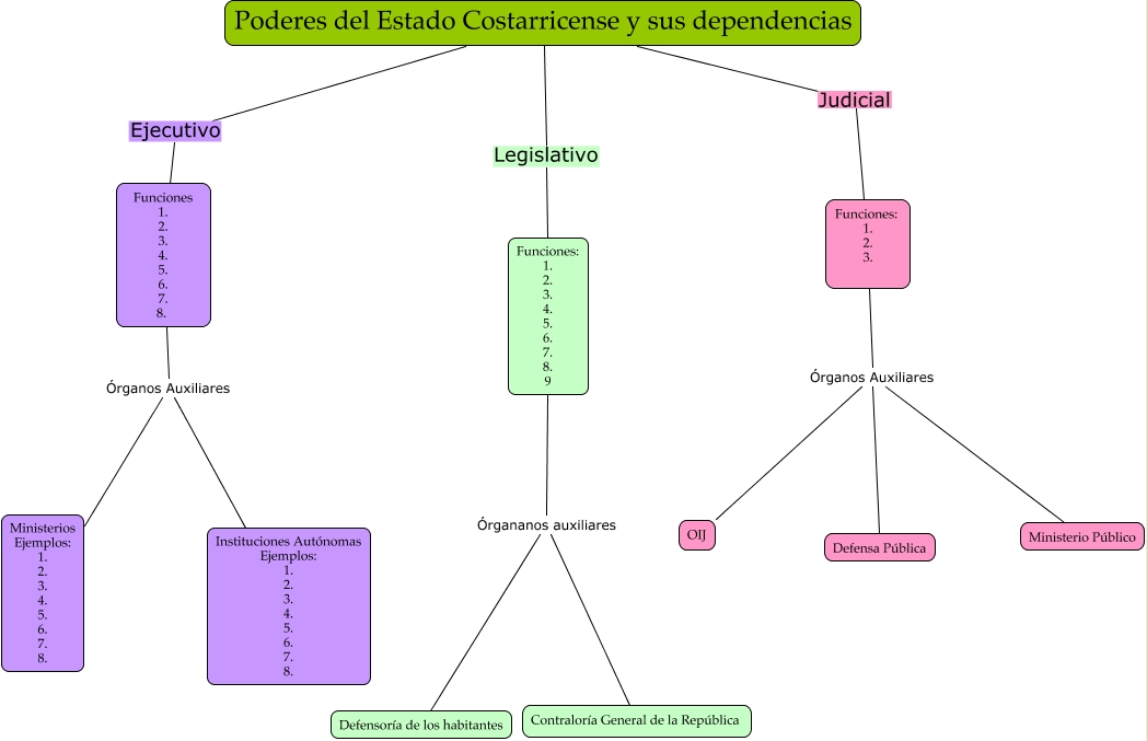 Este Cmap, tiene información relacionada con: Poderes del Estado Costarricense, Funciones: 1. 2. 3. Órganos Auxiliares Defensa Pública, Funciones 1. 2. 3. 4. 5. 6. 7. 8. Órganos Auxiliares Ministerios Ejemplos: 1. 2. 3. 4. 5. 6. 7. 8., Poderes del Estado Costarricense y sus dependencias Judicial Funciones: 1. 2. 3., Funciones 1. 2. 3. 4. 5. 6. 7. 8. Órganos Auxiliares Instituciones Autónomas Ejemplos: 1. 2. 3. 4. 5. 6. 7. 8., Funciones: 1. 2. 3. Órganos Auxiliares Ministerio Público, Funciones: 1. 2. 3. 4. 5. 6. 7. 8. 9 Órgananos auxiliares Contraloría General de la República, Funciones: 1. 2. 3. Órganos Auxiliares OIJ, Poderes del Estado Costarricense y sus dependencias Legislativo Funciones: 1. 2. 3. 4. 5. 6. 7. 8. 9, Funciones: 1. 2. 3. 4. 5. 6. 7. 8. 9 Órgananos auxiliares Defensoría de los habitantes, Poderes del Estado Costarricense y sus dependencias Ejecutivo Funciones 1. 2. 3. 4. 5. 6. 7. 8.
