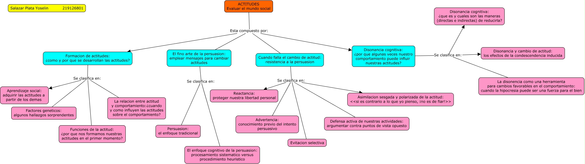 Este Cmap, tiene información relacionada con: Las actitudes, Cuando falla el cambio de actitud: resistencia a la persuasion Se clasifica en: Defensa activa de nuestras actividades: argumentar contra puntos de vista opuesto, Cuando falla el cambio de actitud: resistencia a la persuasion Se clasifica en: Evitacion selectiva, Disonancia cognitiva: ¿por que algunas veces nuestro comportamiento puede influir nuestras actitudes? Se clasifica en: La disonencia como una herramienta para cambios favorables en el comportamiento: cuando la hipocresia puede ser una fuerza para el bien, Formacion de actitudes: ¿como y por que se desarrollan las actitudes? Se clasifica en: Funciones de la actitud: ¿por que nos formamos nuestras actitudes en el primer momento?, Cuando falla el cambio de actitud: resistencia a la persuasion Se clasifica en: Asimilacion sesgada y polarizada de la actitud: <<si es contrario a lo que yo pienso, ¡no es de fiar!>>, ACTITUDES Evaluar el mundo social Esta compuesto por: Disonancia cognitiva: ¿por que algunas veces nuestro comportamiento puede influir nuestras actitudes?, ACTITUDES Evaluar el mundo social Esta compuesto por: El fino arte de la persuasion: emplear mensajes para cambiar actitudes, El fino arte de la persuasion: emplear mensajes para cambiar actitudes Se clasifica en: Persuasion: el enfoque tradicional, ACTITUDES Evaluar el mundo social Esta compuesto por: Cuando falla el cambio de actitud: resistencia a la persuasion, ACTITUDES Evaluar el mundo social Esta compuesto por: Formacion de actitudes: ¿como y por que se desarrollan las actitudes?, Formacion de actitudes: ¿como y por que se desarrollan las actitudes? Se clasifica en: La relacion entre actitud y comportamiento:¿cuando y como influyen las actitudes sobre el comportamiento?, Formacion de actitudes: ¿como y por que se desarrollan las actitudes? Se clasifica en: Aprendizaje social: adquirir las actitudes a partir de los demas, Cuando falla el cambio de actitud: resistencia a la persuasion Se clasifica en: Advertencia: conocimiento previo del intento persuasivo, Formacion de actitudes: ¿como y por que se desarrollan las actitudes? Se clasifica en: Factores geneticos: algunos hallazgos sorprendentes, Disonancia cognitiva: ¿por que algunas veces nuestro comportamiento puede influir nuestras actitudes? Se clasifica en: Disonancia cognitiva: ¿que es y cuales son las maneras (directas e indirectas) de reducirla?, Disonancia cognitiva: ¿por que algunas veces nuestro comportamiento puede influir nuestras actitudes? Se clasifica en: Disonancia y cambio de actitud: los efectos de la condescendencia inducida, Cuando falla el cambio de actitud: resistencia a la persuasion Se clasifica en: Reactancia: proteger nuestra libertad personal, El fino arte de la persuasion: emplear mensajes para cambiar actitudes Se clasifica en: El enfoque cognitivo de la persuasion: procesamiento sistematico versus procedimiento heuristico