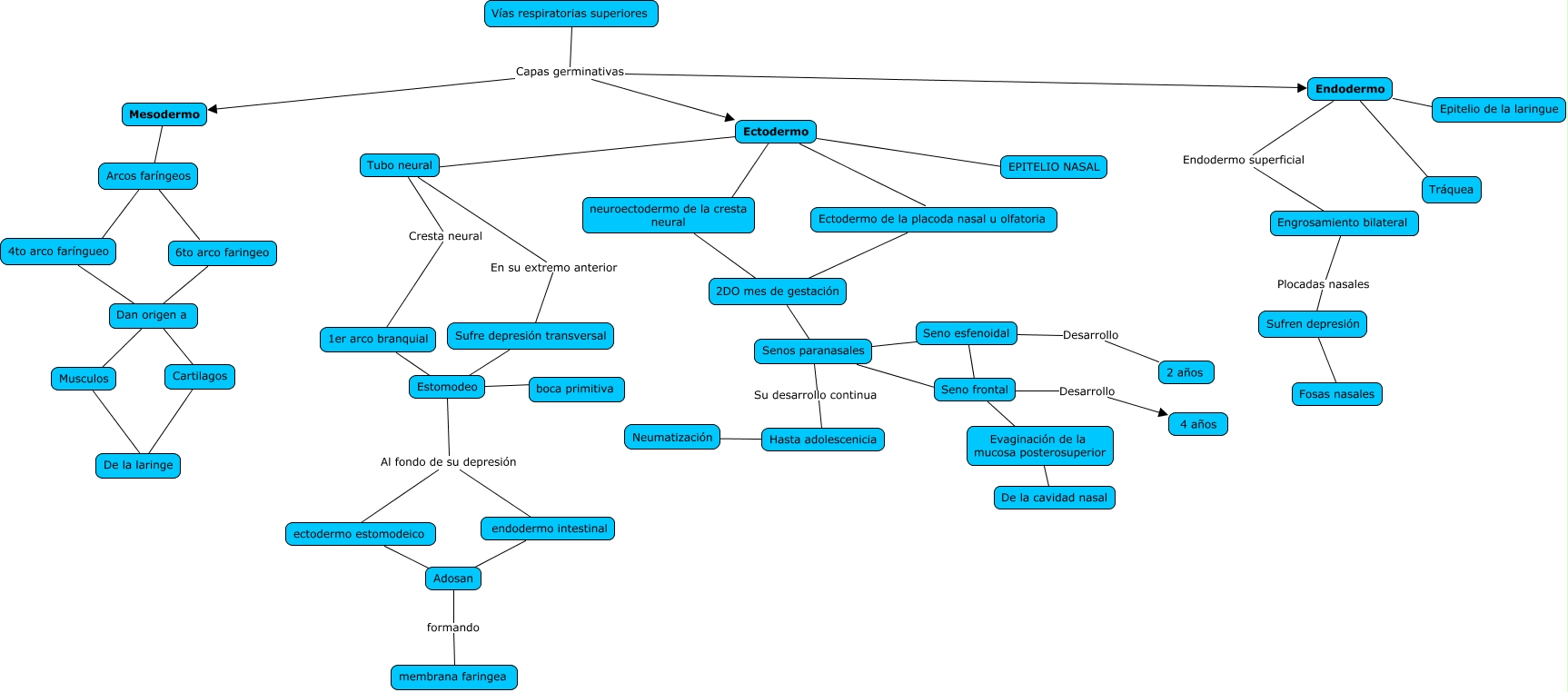 Este Cmap, tiene información relacionada con: embrioo, Vías respiratorias superiores Capas germinativas Mesodermo, neuroectodermo de la cresta neural ???? 2DO mes de gestación, Engrosamiento bilateral Plocadas nasales Sufren depresión, Vías respiratorias superiores Capas germinativas Ectodermo, Seno esfenoidal ???? Seno frontal, Estomodeo Al fondo de su depresión ectodermo estomodeico, 2DO mes de gestación ???? Senos paranasales, ectodermo estomodeico ???? Adosan, Dan origen a ???? Cartilagos, Vías respiratorias superiores Capas germinativas Endodermo, Ectodermo ???? EPITELIO NASAL, Senos paranasales ???? Seno esfenoidal, Endodermo ???? Tráquea, Ectodermo ???? neuroectodermo de la cresta neural, Arcos faríngeos ???? 4to arco faríngueo, Tubo neural Cresta neural 1er arco branquial, Seno esfenoidal Desarrollo 2 años, Adosan formando membrana faringea, Hasta adolescenicia ???? Neumatización, endodermo intestinal ???? Adosan