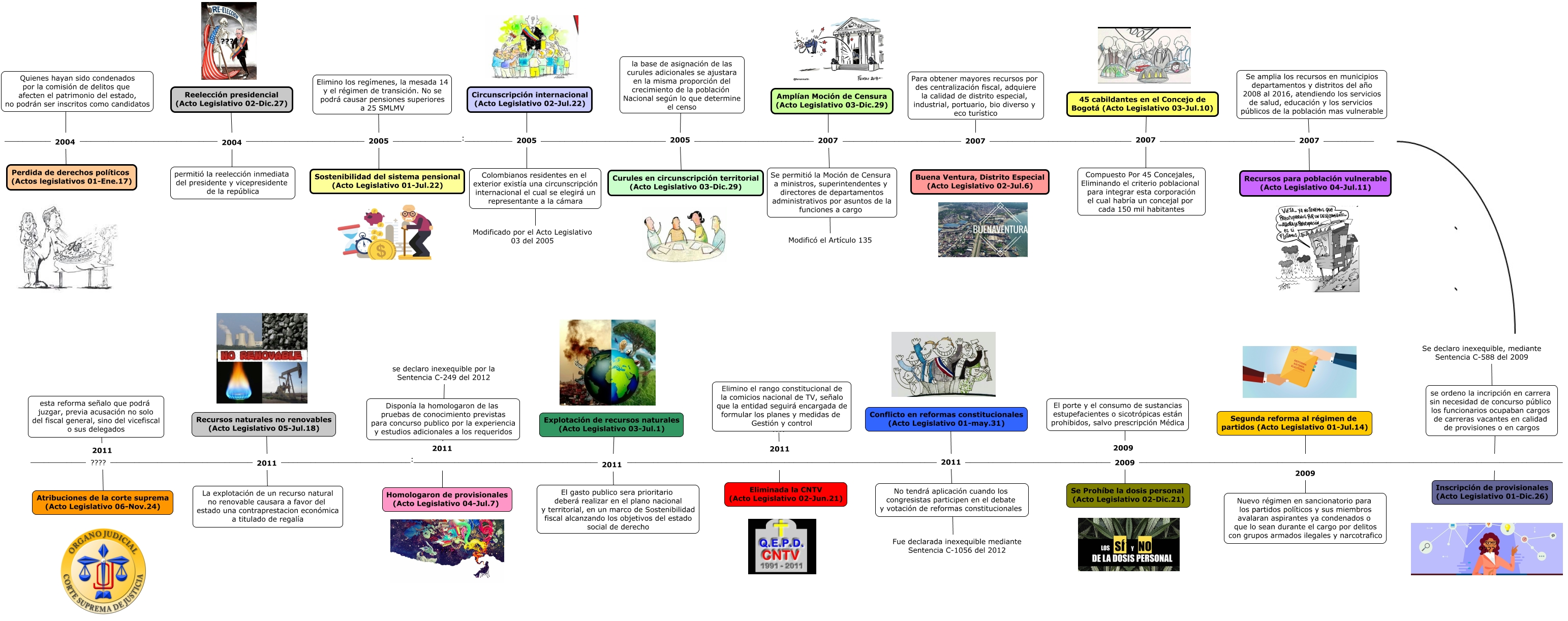 Este Cmap, tiene información relacionada con: Constitución Política 2 (2004-2011), 2005 ???? Elimino los regímenes, la mesada 14 y el régimen de transición. No se podrá causar pensiones superiores a 25 SMLMV, 2007 ???? Para obtener mayores recursos por des centralización fiscal, adquiere la calidad de distrito especial, industrial, portuario, bio diverso y eco turístico, Colombianos residentes en el exterior existía una circunscripción internacional el cual se elegirá un representante a la cámara ???? Modificado por el Acto Legislativo 03 del 2005, 2011 ???? Recursos naturales no renovables (Acto Legislativo 05-Jul.18), 2011 ???? Disponía la homologaron de las pruebas de conocimiento previstas para concurso publico por la experiencia y estudios adicionales a los requeridos, 2004 ???? permitió la reelección inmediata del presidente y vicepresidente de la república, se ordeno la incripción en carrera sin necesidad de concurso público los funcionarios ocupaban cargos de carreras vacantes en calidad de provisiones o en cargos ???? Se declaro inexequible, mediante Sentencia C-588 del 2009, 2004 ???? Quienes hayan sido condenados por la comisión de delitos que afecten el patrimonio del estado, no podrán ser inscritos como candidatos, 2008 ???? se ordeno la incripción en carrera sin necesidad de concurso público los funcionarios ocupaban cargos de carreras vacantes en calidad de provisiones o en cargos, No tendrá aplicación cuando los congresistas participen en el debate y votación de reformas constitucionales ???? Fue declarada inexequible mediante Sentencia C-1056 del 2012, 2009 ???? Se Prohíbe la dosis personal (Acto Legislativo 02-Dic.21), 2008 ???? Inscripción de provisionales (Acto Legislativo 01-Dic.26), 2007 ???? Amplían Moción de Censura (Acto Legislativo 03-Dic.29), 2007 ???? Se permitió la Moción de Censura a ministros, superintendentes y directores de departamentos administrativos por asuntos de la funciones a cargo, 2011 ???? Conflicto en reformas constitucionales (Acto Legislativo 01-may.31), 2011 ???? Elimino el rango constitucional de la comicios nacional de TV, señalo que la entidad seguirá encargada de formular los planes y medidas de Gestión y control, 2011 ???? Eliminada la CNTV (Acto Legislativo 02-Jun.21), 2005 ???? Colombianos residentes en el exterior existía una circunscripción internacional el cual se elegirá un representante a la cámara, 2007 ???? Se amplia los recursos en municipios departamentos y distritos del año 2008 al 2016, atendiendo los servicios de salud, educación y los servicios públicos de la población mas vulnerable, 2011 ???? La explotación de un recurso natural no renovable causara a favor del estado una contraprestacion económica a titulado de regalía