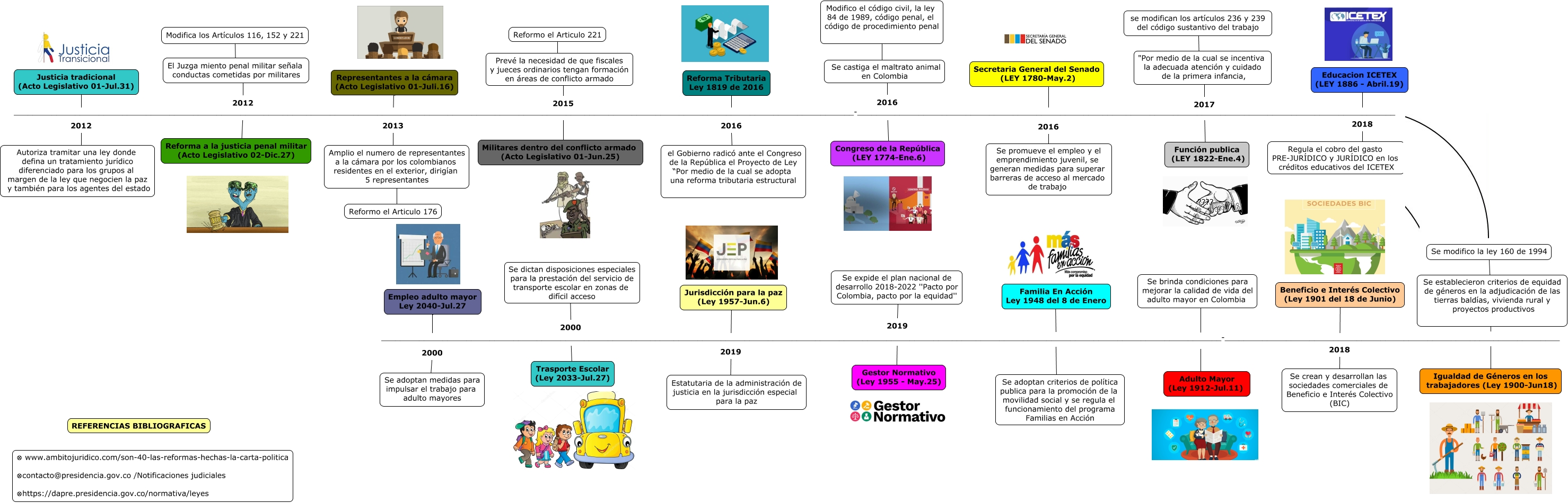 Este Cmap, tiene información relacionada con: constitucion politica 3 (2012-2020), Se crean y desarrollan las sociedades comerciales de Beneficio e Interés Colectivo (BIC) ???? Beneficio e Interés Colectivo (Ley 1901 del 18 de Junio), Amplio el numero de representantes a la cámara por los colombianos residentes en el exterior, dirigían 5 representantes ???? Reformo el Articulo 176, Igualdad de Géneros en los trabajadores (Ley 1900-Jun18) ???? Se establecieron criterios de equidad de géneros en la adjudicación de las tierras baldías, vivienda rural y proyectos productivos, 2013 ???? Amplio el numero de representantes a la cámara por los colombianos residentes en el exterior, dirigían 5 representantes, 2019 ???? Familia En Acción Ley 1948 del 8 de Enero, 2017 ???? Función publica (LEY 1822-Ene.4), 2016 ???? el Gobierno radicó ante el Congreso de la República el Proyecto de Ley “Por medio de la cual se adopta una reforma tributaria estructural, 2019 ???? Jurisdicción para la paz (Ley 1957-Jun.6), 2012 ???? Justicia tradicional (Acto Legislativo 01-Jul.31), 2018 ???? Educacion ICETEX (LEY 1886 - Abril.19), 2015 ???? Prevé la necesidad de que fiscales y jueces ordinarios tengan formación en áreas de conflicto armado, 2019 ???? Se expide el plan nacional de desarrollo 2018-2022 ''Pacto por Colombia, pacto por la equidad'', 2012 ???? El Juzga miento penal militar señala conductas cometidas por militares, 2000 ???? Se dictan disposiciones especiales para la prestación del servicio de transporte escolar en zonas de difícil acceso, Se modifico la ley 160 de 1994 ???? Se establecieron criterios de equidad de géneros en la adjudicación de las tierras baldías, vivienda rural y proyectos productivos, se modifican los artículos 236 y 239 del código sustantivo del trabajo ???? "Por medio de la cual se incentiva la adecuada atención y cuidado de la primera infancia,, 2019 ???? Estatutaria de la administración de justicia en la jurisdicción especial para la paz, 2012 ???? Autoriza tramitar una ley donde defina un tratamiento jurídico diferenciado para los grupos al margen de la ley que negocien la paz y también para los agentes del estado, 2012 ???? Reforma a la justicia penal militar (Acto Legislativo 02-Dic.27), 2016 ???? Se castiga el maltrato animal en Colombia