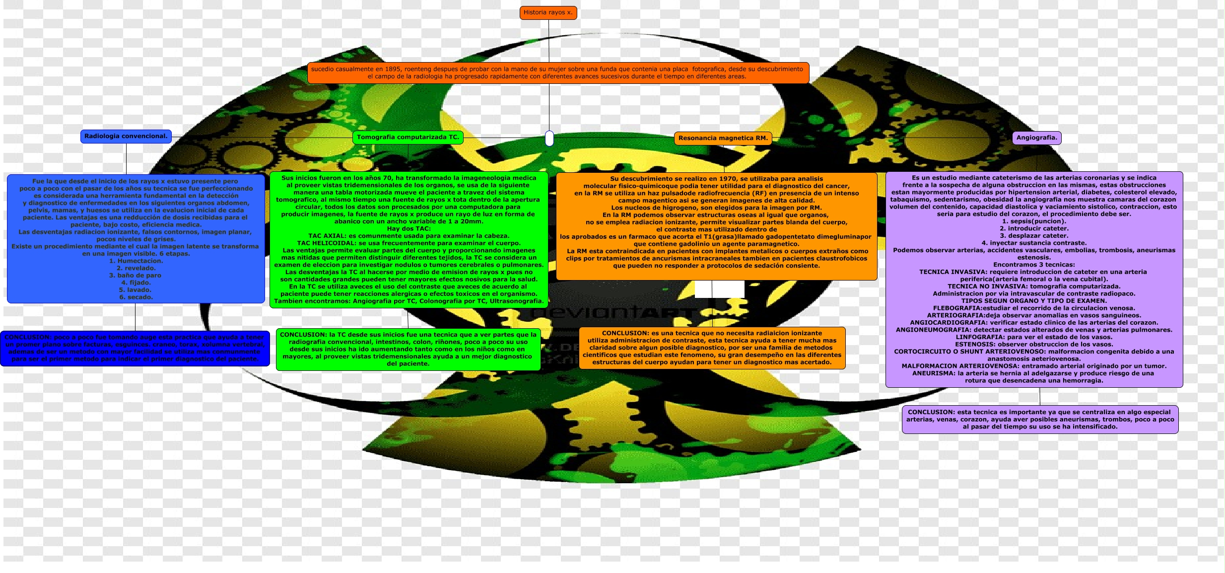Este Cmap, tiene información relacionada con: rayos x, Tomografia computarizada TC. ???? Angiografia., Es un estudio mediante cateterismo de las arterias coronarias y se indica frente a la sospecha de alguna obstruccion en las mismas, estas obstrucciones estan mayormente producidas por hipertension arterial, diabetes, colesterol elevado, tabaquismo, sedentarismo, obesidad la angiografia nos muestra camaras del corazon volumen del contenido, capacidad diastolica y vaciamiento sistolico, contraccion, esto seria para estudio del corazon, el procedimiento debe ser. 1. sepsis(puncion). 2. introducir cateter. 3. desplazar cateter. 4. inyectar sustancia contraste. Podemos observar arterias, accidentes vasculares, embolias, trombosis, aneurismas estenosis. Encontramos 3 tecnicas: TECNICA INVASIVA: requiere introduccion de cateter en una arteria periferica(arteria femoral o la vena cubital). TECNICA NO INVASIVA: tomografia computarizada. Administracion por via intravascular de contraste radiopaco. TIPOS SEGUN ORGANO Y TIPO DE EXAMEN. FLEBOGRAFIA:estudiar el recorrido de la circulacion venosa. ARTERIOGRAFIA:deja observar anomalias en vasos sanguineos. ANGIOCARDIOGRAFIA: verificar estado clinico de las arterias del corazon. ANGIONEUMOGRAFIA: detectar estados alterados de venas y arterias pulmonares. LINFOGRAFIA: para ver el estado de los vasos. ESTENOSIS: observer obstruccion de los vasos. CORTOCIRCUITO O SHUNT ARTERIOVENOSO: malformacion congenita debido a una anastomosis aeteriovenosa. MALFORMACION ARTERIOVENOSA: entramado arterial originado por un tumor. ANEURISMA: la arteria se hernia al adelgazarse y produce riesgo de una rotura que desencadena una hemorragia. ???? CONCLUSION: esta tecnica es importante ya que se centraliza en algo especial arterias, venas, corazon, ayuda aver posibles aneurismas, trombos, poco a poco al pasar del tiempo su uso se ha intensificado., Historia rayos x. ????, Tomografia computarizada TC. ???? Resonancia magnetica RM., Tomografia computarizada TC. ???? Sus inicios fueron en los años 70, ha transformado la imageneologia medica al proveer vistas tridemensionales de los organos, se usa de la siguiente manera una tabla motorizada mueve el paciente a travez del sistema tomografico, al mismo tiempo una fuente de rayos x tota dentro de la apertura circular, todos los datos son procesados por una computadora para producir imagenes, la fuente de rayos x produce un rayo de luz en forma de abanico con un ancho variable de 1 a 20mm. Hay dos TAC: TAC AXIAL: es comunmente usada para examinar la cabeza. TAC HELICOIDAL: se usa frecuentemente para examinar el cuerpo. Las ventajas permite evaluar partes del cuerpo y proporcionando imagenes mas nitidas que permiten distinguir diferentes tejidos, la TC se considera un examen de eleccion para investigar nodulos o tumores cerebrales o pulmonares. Las desventajas la TC al hacerse por medio de emision de rayos x pues no son cantidades grandes pueden tener mayores efectos nosivos para la salud. En la TC se utiliza aveces el uso del contraste que aveces de acuerdo al paciente puede tener reacciones alergicas o efectos toxicos en el organismo. Tambien encontramos: Angiografia por TC, Colonografia por TC, Ultrasonografia., Sus inicios fueron en los años 70, ha transformado la imageneologia medica al proveer vistas tridemensionales de los organos, se usa de la siguiente manera una tabla motorizada mueve el paciente a travez del sistema tomografico, al mismo tiempo una fuente de rayos x tota dentro de la apertura circular, todos los datos son procesados por una computadora para producir imagenes, la fuente de rayos x produce un rayo de luz en forma de abanico con un ancho variable de 1 a 20mm. Hay dos TAC: TAC AXIAL: es comunmente usada para examinar la cabeza. TAC HELICOIDAL: se usa frecuentemente para examinar el cuerpo. Las ventajas permite evaluar partes del cuerpo y proporcionando imagenes mas nitidas que permiten distinguir diferentes tejidos, la TC se considera un examen de eleccion para investigar nodulos o tumores cerebrales o pulmonares. Las desventajas la TC al hacerse por medio de emision de rayos x pues no son cantidades grandes pueden tener mayores efectos nosivos para la salud. En la TC se utiliza aveces el uso del contraste que aveces de acuerdo al paciente puede tener reacciones alergicas o efectos toxicos en el organismo. Tambien encontramos: Angiografia por TC, Colonografia por TC, Ultrasonografia. ???? CONCLUSION: la TC desde sus inicios fue una tecnica que a ver partes que la radiografia convencional, intestinos, colon, riñones, poco a poco su uso desde sus inicios ha ido aumentando tanto como en los niños como en mayores, al proveer vistas tridemensionales ayuda a un mejor diagnostico del paciente., Resonancia magnetica RM. ???? Su descubrimiento se realizo en 1970, se utilizaba para analisis molecular fisico-quimicoque podia tener utilidad para el diagnostico del cancer, en la RM se utiliza un haz pulsadode radiofrecuencia (RF) en presencia de un intenso campo magentico asi se generan imagenes de alta calidad. Los nucleos de higrogeno, son elegidos para la imagen por RM. En la RM podemos observar estructuras oseas al igual que organos, no se emplea radiacion ionizante, permite visualizar partes blanda del cuerpo, el contraste mas utilizado dentro de los aprobados es un farmaco que acorta el T1(grasa)llamado gadopentetato dimegluminapor que contiene gadolinio un agente paramagnetico. La RM esta contraindicada en pacientes con implantes metalicos o cuerpos extraños como clips por tratamientos de ancurismas intracraneales tambien en pacientes claustrofobicos que pueden no responder a protocolos de sedación consiente., Angiografia. ???? Es un estudio mediante cateterismo de las arterias coronarias y se indica frente a la sospecha de alguna obstruccion en las mismas, estas obstrucciones estan mayormente producidas por hipertension arterial, diabetes, colesterol elevado, tabaquismo, sedentarismo, obesidad la angiografia