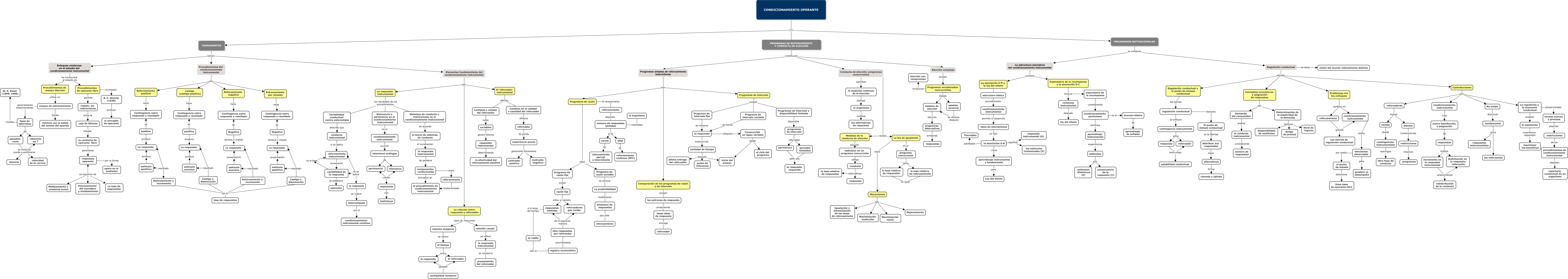 Este Cmap, tiene información relacionada con: CONDICIONAMIENTO OPERANTE, B. F. Skinner (1938) propuso el concepto de operante, tipos de laberintos en laberinto en T, Reforzamiento positivo tiene Contingencia entre respuesta y resultado, condicionamiento instrumental permite el desarrollo tipos de asociaciones, relación causal se refiere la respuesta instrumental, reforzador de pende experiencia previa, reforzamiento depende número de respuestas emitidas, La respuesta instrumental los resultados de los procedimientos Variabilidad conductual contra estereotipia, respuesta interrumpe estabilidad conductual, regulación conductual se enfocan contingencia instrumental, nueva distribución, o asignación de respuestas, Expectativa de la recompensa y la asociación E-C motivar expectativa de la recompensa, incremento en la respuesta instrumental características redistribución de la conducta, contigüidad temporal ejemplo el reforzador, PROGRAMAS DE REFORZAMIENTO Y CONDUCTA DE ELECCIÓN constituyen Elección compleja, La regulación y la economía conductual proporcionado formas nuevas y precisas, Relevancia o pertinencia en el condicionamiento instrumental en el condicionamiento instrumental, No existe distinción fundamental, La respuesta instrumental los resultados de los procedimientos Relevancia o pertinencia en el condicionamiento instrumental, variabilidad de la respuesta se establece operante