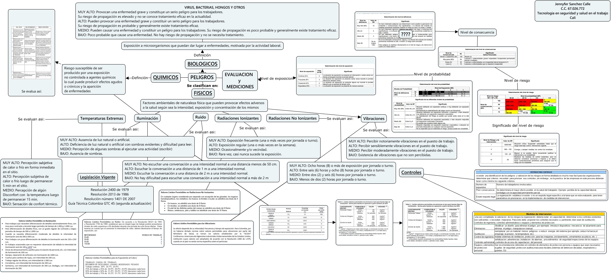 Este Cmap, tiene información relacionada con: Peligros, Radiaciones Ionizantes ????, Exposición a microorganismos que puedan dar lugar a enfermedades, motivada por la actividad laboral. Se evaluan asi: VIRUS, BACTERIAS, HONGOS Y OTROS MUY ALTO: Provocan una enfermedad grave y constituye un serio peligro para los trabajadores. Su riesgo de propagación es elevado y no se conoce tratamiento eficaz en la actualidad. ALTO: Pueden provocar una enfermedad grave y constituir un serio peligro para los trabajadores. Su riesgo de propagación es probable y generalmente existe tratamiento eficaz. MEDIO: Pueden causar una enfermedad y constituir un peligro para los trabajadores. Su riesgo de propagación es poco probable y generalmente existe tratamiento eficaz. BAJO: Poco probable que cause una enfermedad. No hay riesgo de propagación y no se necesita tratamiento., Ruido ????, Radiaciones No Ionizantes Se evaluan asi: MUY ALTO: Ocho horas (8) o más de exposición por jornada o turno. ALTO: Entre seis (6) horas y ocho (8) horas por jornada o turno. MEDIO: Entre dos (2) y seis (6) horas por jornada o turno. BAJO: Menos de dos (2) horas por jornada o turno., Legislación Vigente ???? Resolución 2400 de 1979 Resolución 2013 de 1986 Resolución número 1401 DE 2007 Guía Técnica Colombia GTC 45 (segunda actualización), Radiaciones Ionizantes Se evaluan asi: MUY ALTO: Exposición frecuente (una o más veces por jornada o turno). ALTO: Exposición regular (una o más veces en la semana). MEDIO: Ocasionalmente y/o vecindad. BAJO: Rara vez, casi nunca sucede la exposición., BIOLOGICOS Definición Exposición a microorganismos que puedan dar lugar a enfermedades, motivada por la actividad laboral., Riesgo susceptible de ser producido por una exposición no controlada a agentes químicos la cual puede producir efectos agudos o crónicos y la aparición de enfermedades ???? Se evalua asi:, Iluminación Se evaluan asi: MUY ALTO: Ausencia de luz natural o artificial. ALTO: Deficiencia de luz natural o artificial con sombras evidentes y dificultad para leer. MEDIO: Percepción de algunas sombras al ejecutar una actividad (escribir) BAJO: Ausencia de sombras., Temperaturas Extremas ????, Factores ambientales de naturaleza física que pueden provocar efectos adversos a la salud según sea la intensidad, exposición y concentración de los mismos ???? Vibraciones, Riesgo susceptible de ser producido por una exposición no controlada a agentes químicos la cual puede producir efectos agudos o crónicos y la aparición de enfermedades ????, Nivel de probabilidad, Vibraciones ????, Controles ????, Nivel de consecuencia ????, Controles ????, PELIGROS ???? QUIMICOS, Temperaturas Extremas ????, PELIGROS Se clasifican en: FISICOS
