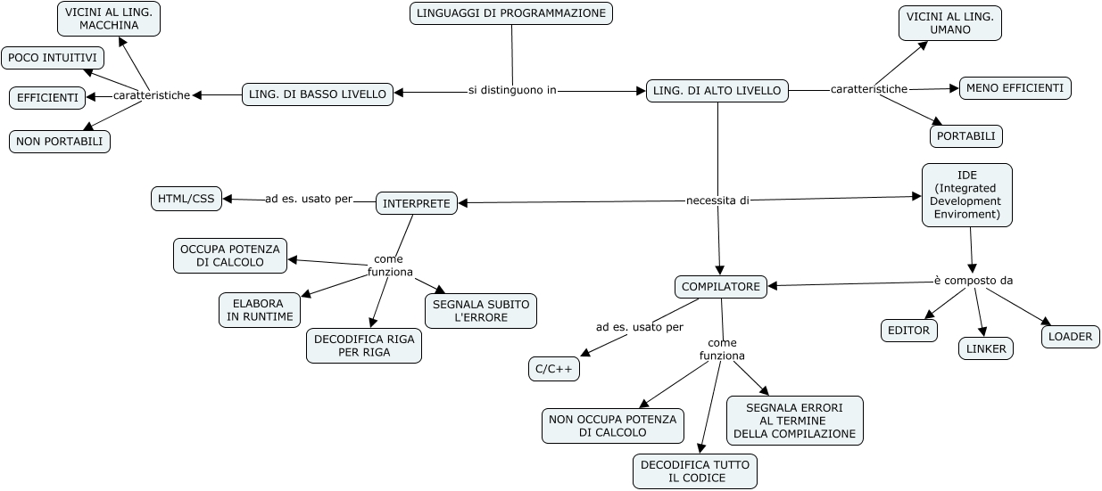 Questa Cmap, creata con IHMC CmapTools, contiene informazioni relative a: LinguaggiProgrammazione, INTERPRETE come funziona SEGNALA SUBITO L'ERRORE, COMPILATORE come funziona SEGNALA ERRORI AL TERMINE DELLA COMPILAZIONE, LING. DI ALTO LIVELLO caratteristiche VICINI AL LING. UMANO, INTERPRETE come funziona ELABORA IN RUNTIME, LING. DI ALTO LIVELLO necessita di COMPILATORE, LING. DI ALTO LIVELLO necessita di INTERPRETE, IDE (Integrated Development Enviroment) è composto da COMPILATORE, IDE (Integrated Development Enviroment) è composto da LINKER, COMPILATORE come funziona NON OCCUPA POTENZA DI CALCOLO, INTERPRETE ad es. usato per HTML/CSS, LING. DI BASSO LIVELLO caratteristiche NON PORTABILI, COMPILATORE come funziona DECODIFICA TUTTO IL CODICE, LING. DI ALTO LIVELLO caratteristiche MENO EFFICIENTI, LINGUAGGI DI PROGRAMMAZIONE si distinguono in LING. DI BASSO LIVELLO, IDE (Integrated Development Enviroment) è composto da LOADER, LING. DI BASSO LIVELLO caratteristiche POCO INTUITIVI, LING. DI ALTO LIVELLO caratteristiche PORTABILI, INTERPRETE come funziona DECODIFICA RIGA PER RIGA, IDE (Integrated Development Enviroment) è composto da EDITOR, LING. DI ALTO LIVELLO necessita di IDE (Integrated Development Enviroment)