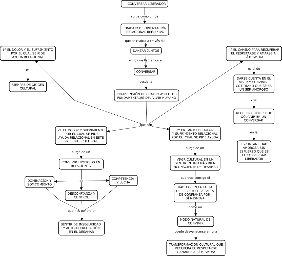 Este Cmap, tiene información relacionada con: Conversar liberador, DESCONFIANZA Y CONTROL que nos genera un SENTIR DE INSEGURIDAD Y AUTO-DEPRECIACIÓN EN EL DESAMAR, DOMINACIÓN Y SOMETIMIENTO que nos genera un SENTIR DE INSEGURIDAD Y AUTO-DEPRECIACIÓN EN EL DESAMAR, COMPRENSIÓN DE CUATRO ASPECTOS FUNDAMENTALES DEL VIVIR HUMANO que son 1º EL DOLOR Y EL SUFRIMIENTO POR EL CUAL SE PIDE AYUDA RELACIONAL, DANZAR JUNTOS en lo que llamamos el CONVERSAR, CONVERSAR LIBERADOR surge como un de TRABAJO DE ORIENTACIÓN RELACIONAL REFLEXIVO, HABITAR EN LA FALTA DE RESPETO Y LA FALTA DE CONFIANZA POR SÍ MISMO/A como un MODO NATURAL DE CONVIVIR, CONVIVIR INMERSOS EN RELACIONES de DESCONFIANZA Y CONTROL, COMPRENSIÓN DE CUATRO ASPECTOS FUNDAMENTALES DEL VIVIR HUMANO que son 3º EN TANTO EL DOLOR Y SUFRIMIENTO RELACIONAL POR EL CUAL SE PIDE AYUDA, RECUPERACIÓN PUEDE OCURRIR EN UN CONVERSAR en la ESPONTANEIDAD AMOROSA SIN ESFUERZO QUE ES EL CONVERSAR LIBERADOR, CONVIVIR INMERSOS EN RELACIONES de DOMINACIÓN Y SOMETIMIENTO, 4º EL CAMINO PARA RECUPERAR EL RESPETARSE Y AMARSE A SÍ MISMO/A es el de DARSE CUENTA EN EL VIVIR Y CONVIVIR COTIDIANO QUE SE ES UN SER AMOROSO, COMPRENSIÓN DE CUATRO ASPECTOS FUNDAMENTALES DEL VIVIR HUMANO que son 2º EL DOLOR Y SUFRIMIENTO POR EL CUAL SE PIDE AYUDA RELACIONAL EN ESTE PRESENTE CULTURAL, TRABAJO DE ORIENTACIÓN RELACIONAL REFLEXIVO que se realiza a través del DANZAR JUNTOS, COMPETENCIA Y LUCHA que nos genera un SENTIR DE INSEGURIDAD Y AUTO-DEPRECIACIÓN EN EL DESAMAR, VIVIR CULTURAL EN UN SENTIR ÍNTIMO MÁS BIEN INCONSCIENTE DE DESAMAR que trae consigo el HABITAR EN LA FALTA DE RESPETO Y LA FALTA DE CONFIANZA POR SÍ MISMO/A, CONVIVIR INMERSOS EN RELACIONES de COMPETENCIA Y LUCHA, 2º EL DOLOR Y SUFRIMIENTO POR EL CUAL SE PIDE AYUDA RELACIONAL EN ESTE PRESENTE CULTURAL surge de un CONVIVIR INMERSOS EN RELACIONES, DARSE CUENTA EN EL VIVIR Y CONVIVIR COTIDIANO QUE SE ES UN SER AMOROSO y tal RECUPERACIÓN PUEDE OCURRIR EN UN CONVERSAR, CONVERSAR desde la COMPRENSIÓN DE CUATRO ASPECTOS FUNDAMENTALES DEL VIVIR HUMANO, 3º EN TANTO EL DOLOR Y SUFRIMIENTO RELACIONAL POR EL CUAL SE PIDE AYUDA surge de un VIVIR CULTURAL EN UN SENTIR ÍNTIMO MÁS BIEN INCONSCIENTE DE DESAMAR