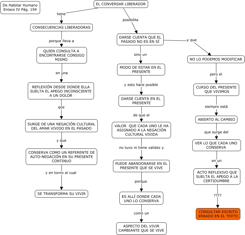 Este Cmap, tiene información relacionada con: Conversar liberador consecuencias terapéuticas, EL CONVERSAR LIBERADOR posibilita DARSE CUENTA QUE EL PASADO NO ES EN SÍ, PUEDE ABANDONARSE EN EL PRESENTE QUE SE VIVE porque ES ALLÍ DONDE CADA UNO LO CONSERVA, QUIEN CONSULTA A ENCONTRARSE CONSIGO MISMO en una REFLEXIÓN DESDE DONDE ELLA SUELTA EL APEGO INCONSCIENTE A UN DOLOR, NO LO PODEMOS MODIFICAR pero el CURSO DEL PRESENTE QUE VIVIMOS, CONSERVA COMO UN REFERENTE DE AUTO-NEGACIÓN EN SU PRESENTE CONTINUO y en torno al cual SE TRANSFORMA SU VIVIR, VER LO QUE CADA UNO CONSERVA en un ACTO REFLEXIVO QUE SUELTA EL APEGO A LA CERTIDUMBRE, CURSO DEL PRESENTE QUE VIVIMOS siempre está ABIERTO AL CAMBIO, ACTO REFLEXIVO QUE SUELTA EL APEGO A LA CERTIDUMBRE ???? CONSULTAR ESCRITO ERRADO EN EL TEXTO, DARSE CUENTA EN EL PRESENTE de que el VALOR QUE CADA UNO LE HA ASIGNADO A LA NEGACIÓN CULTURAL VIVIDA, CONSECUENCIAS LIBERADORAS porque lleva a QUIEN CONSULTA A ENCONTRARSE CONSIGO MISMO, VALOR QUE CADA UNO LE HA ASIGNADO A LA NEGACIÓN CULTURAL VIVIDA no tuvo ni tiene validez y PUEDE ABANDONARSE EN EL PRESENTE QUE SE VIVE, DARSE CUENTA QUE EL PASADO NO ES EN SÍ sino un MODO DE ESTAR EN EL PRESENTE, DARSE CUENTA QUE EL PASADO NO ES EN SÍ y que NO LO PODEMOS MODIFICAR, ES ALLÍ DONDE CADA UNO LO CONSERVA como un ASPECTO DEL VIVIR CAMBIANTE QUE SE VIVE, ABIERTO AL CAMBIO que surge del VER LO QUE CADA UNO CONSERVA, SURGE DE UNA NEGACIÓN CULTURAL DEL AMAR VIVIDO EN EL PASADO y que CONSERVA COMO UN REFERENTE DE AUTO-NEGACIÓN EN SU PRESENTE CONTINUO, MODO DE ESTAR EN EL PRESENTE y esto hace posible DARSE CUENTA EN EL PRESENTE, REFLEXIÓN DESDE DONDE ELLA SUELTA EL APEGO INCONSCIENTE A UN DOLOR que SURGE DE UNA NEGACIÓN CULTURAL DEL AMAR VIVIDO EN EL PASADO, EL CONVERSAR LIBERADOR tiene CONSECUENCIAS LIBERADORAS