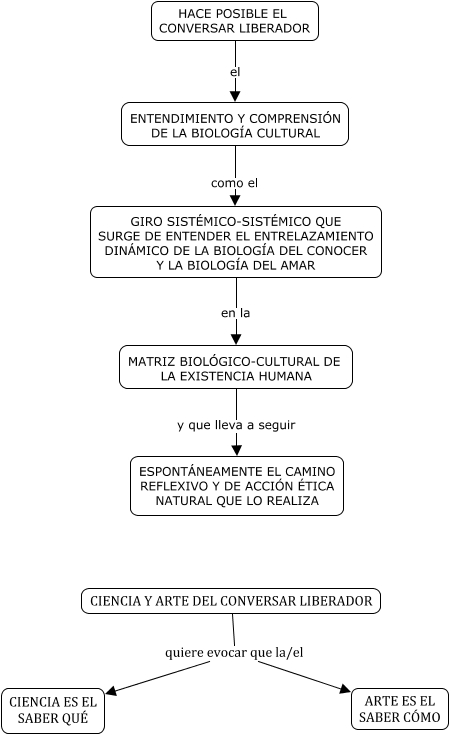 Este Cmap, tiene información relacionada con: HACE POSIBLE EL CONVERSAR LIBERADOR. CIENCIA Y ARTE, ENTENDIMIENTO Y COMPRENSIÓN DE LA BIOLOGÍA CULTURAL como el GIRO SISTÉMICO-SISTÉMICO QUE SURGE DE ENTENDER EL ENTRELAZAMIENTO DINÁMICO DE LA BIOLOGÍA DEL CONOCER Y LA BIOLOGÍA DEL AMAR, HACE POSIBLE EL CONVERSAR LIBERADOR el ENTENDIMIENTO Y COMPRENSIÓN DE LA BIOLOGÍA CULTURAL, CIENCIA Y ARTE DEL CONVERSAR LIBERADOR quiere evocar que la/el CIENCIA ES EL SABER QUÉ, CIENCIA Y ARTE DEL CONVERSAR LIBERADOR quiere evocar que la/el ARTE ES EL SABER CÓMO, GIRO SISTÉMICO-SISTÉMICO QUE SURGE DE ENTENDER EL ENTRELAZAMIENTO DINÁMICO DE LA BIOLOGÍA DEL CONOCER Y LA BIOLOGÍA DEL AMAR en la MATRIZ BIOLÓGICO-CULTURAL DE LA EXISTENCIA HUMANA, MATRIZ BIOLÓGICO-CULTURAL DE LA EXISTENCIA HUMANA y que lleva a seguir ESPONTÁNEAMENTE EL CAMINO REFLEXIVO Y DE ACCIÓN ÉTICA NATURAL QUE LO REALIZA