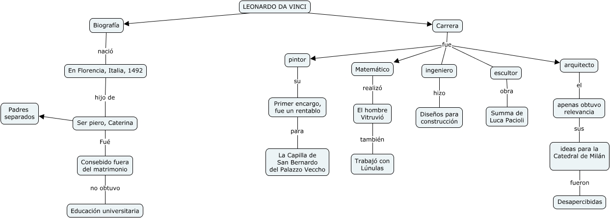 Este Cmap, tiene información relacionada con: Leonardo Da Vinci, Matemático realizó El hombre Vitruvió, Biografía nació En Florencia, Italia, 1492, LEONARDO DA VINCI ???? Biografía, Consebido fuera del matrimonio no obtuvo Educación universitaria, Carrera fue escultor, escultor obra Summa de Luca Pacioli, LEONARDO DA VINCI ???? Carrera, Carrera fue ingeniero, En Florencia, Italia, 1492 hijo de Ser piero, Caterina, El hombre Vitruvió también Trabajó con Lúnulas, Carrera fue Matemático, ideas para la Catedral de Milán fueron Desapercibidas, Carrera fue pintor, ingeniero hizo Diseños para construcción, Primer encargo, fue un rentablo para La Capilla de San Bernardo del Palazzo Veccho, apenas obtuvo relevancia sus ideas para la Catedral de Milán, Ser piero, Caterina Fué Consebido fuera del matrimonio, pintor su Primer encargo, fue un rentablo, Carrera fue arquitecto, arquitecto el apenas obtuvo relevancia