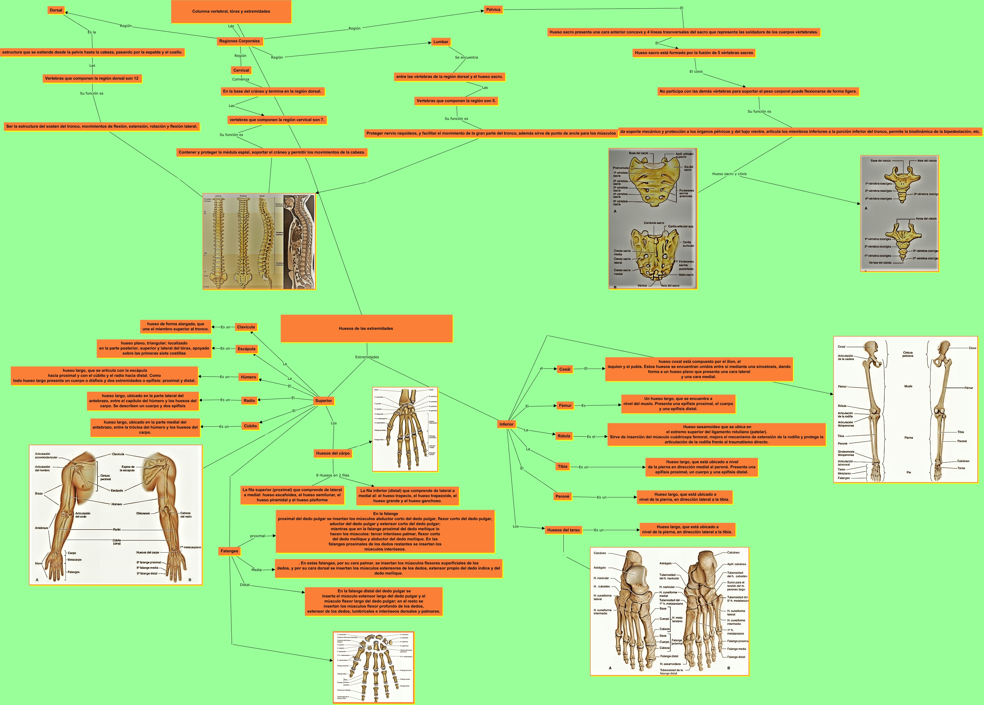 Este Cmap, tiene información relacionada con: Columna vertebral, tórax y extremidades, Inferior ., Falanges Media . En estas falanges, por su cara palmar, se insertan los músculos flexores superficiales de los dedos, y por su cara dorsal se insertan los músculos extensores de los dedos, extensor propio del dedo índice y del dedo meñique., Lumbar Se encuentra entre las vértebras de la región dorsal y el hueso sacro., Cervical Comienza En la base del cráneo y termina en la región dorsal., Inferior Los Huesos del tarso, Superior . Falanges, Cúbito Es un hueso largo, ubicado en la parte medial del antebrazo, entre la tróclea del húmero y los huesos del carpo., Superior El Radio, Hueso sacro está formado por la fusión de 5 vértebras sacras El cóxis No participa con las demás vértebras para soportar el peso corporal puede flexionarse de forma ligera., Regiones Corporales Región Cervical, Rótula Es el Hueso sesamoideo que se ubica en el extremo superior del ligamento rotuliano (patelar). Sirve de inserción del músculo cuádriceps femoral, mejora el mecanismo de extensión de la rodilla y protege la articulación de la rodilla frente al traumatismo directo., Huesos de las extremidades Extremidades Inferior, Inferior La Rótula, Inferior La Tibia, Columna vertebral, tórax y extremidades Las Regiones Corporales, vertebras que componen la región cervical son 7. Su función es Contener y proteger la médula espial, soportar el cráneo y permitír los movimientos de la cabeza., Regiones Corporales Región Pélvica, estructura que se extiende desde la pelvis hasta la cabeza, pasando por la espalda y el cuello. Las Vertebras que componen la región dorsal son 12, Proteger nervio raquídeos, y facilitar el movimiento de la gran parte del tronco, además sirve de punto de ancle para los músculos ., Radio Es un hueso largo, ubicado en la parte lateral del antebrazo, entre el capítulo del húmero y los huesos del carpo. Se describen un cuerpo y dos epífisis