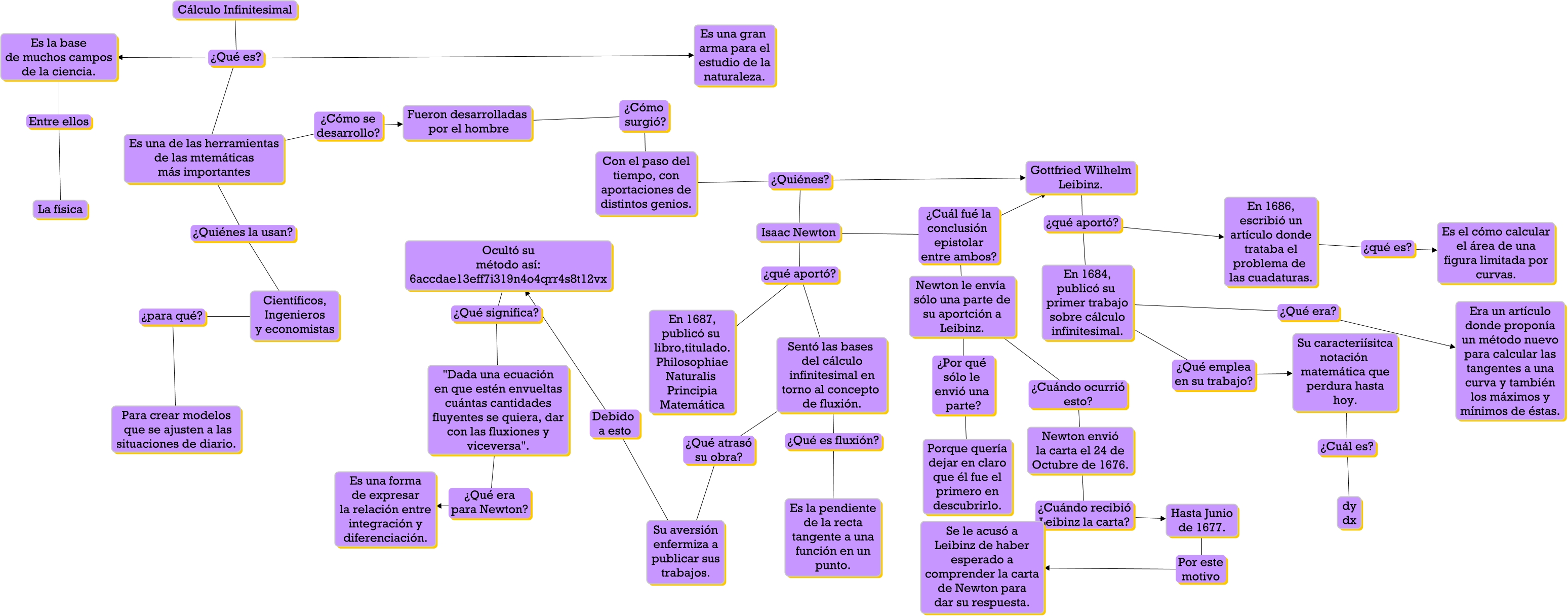 Este Cmap, tiene información relacionada con: Equipo 7 grupo 4 Cálculo, "Dada una ecuación en que estén envueltas cuántas cantidades fluyentes se quiera, dar con las fluxiones y viceversa". ¿Qué era para Newton? Es una forma de expresar la relación entre integración y diferenciación., Gottfried Wilhelm Leibinz. ¿qué aportó? En 1686, escribió un artículo donde trataba el problema de las cuadaturas., Ocultó su método así: 6accdae13eff7i319n4o4qrr4s8t12vx ¿Qué significa? "Dada una ecuación en que estén envueltas cuántas cantidades fluyentes se quiera, dar con las fluxiones y viceversa"., Isaac Newton ¿qué aportó? En 1687, publicó su libro,titulado. Philosophiae Naturalis Principia Matemática, Es la base de muchos campos de la ciencia. Entre ellos La física, Isaac Newton ¿Cuál fué la conclusión epistolar entre ambos? Newton le envía sólo una parte de su aportción a Leibinz., Cálculo Infinitesimal ¿Qué es? Es una de las herramientas de las mtemáticas más importantes, Hasta Junio de 1677. Por este motivo Se le acusó a Leibinz de haber esperado a comprender la carta de Newton para dar su respuesta., En 1684, publicó su primer trabajo sobre cálculo infinitesimal. ¿Qué emplea en su trabajo? Su caracteriísitca notación matemática que perdura hasta hoy., Gottfried Wilhelm Leibinz. ¿qué aportó? En 1684, publicó su primer trabajo sobre cálculo infinitesimal., Cálculo Infinitesimal ¿Qué es? Es la base de muchos campos de la ciencia., Cálculo Infinitesimal ¿Qué es? Es una gran arma para el estudio de la naturaleza., Newton envió la carta el 24 de Octubre de 1676. ¿Cuándo recibió Leibinz la carta? Hasta Junio de 1677., Con el paso del tiempo, con aportaciones de distintos genios. ¿Quiénes? Isaac Newton, Su aversión enfermiza a publicar sus trabajos. Debido a esto Ocultó su método así: 6accdae13eff7i319n4o4qrr4s8t12vx, Es una de las herramientas de las mtemáticas más importantes ¿Quiénes la usan? Científicos, Ingenieros y economistas, Isaac Newton ¿qué aportó? Sentó las bases del cálculo infinitesimal en torno al concepto de fluxión., En 1684, publicó su primer trabajo sobre cálculo infinitesimal. ¿Qué era? Era un artículo donde proponía un método nuevo para calcular las tangentes a una curva y también los máximos y mínimos de éstas., Sentó las bases del cálculo infinitesimal en torno al concepto de fluxión. ¿Qué es fluxión? Es la pendiente de la recta tangente a una función en un punto., Científicos, Ingenieros y economistas ¿para qué? Para crear modelos que se ajusten a las situaciones de diario.