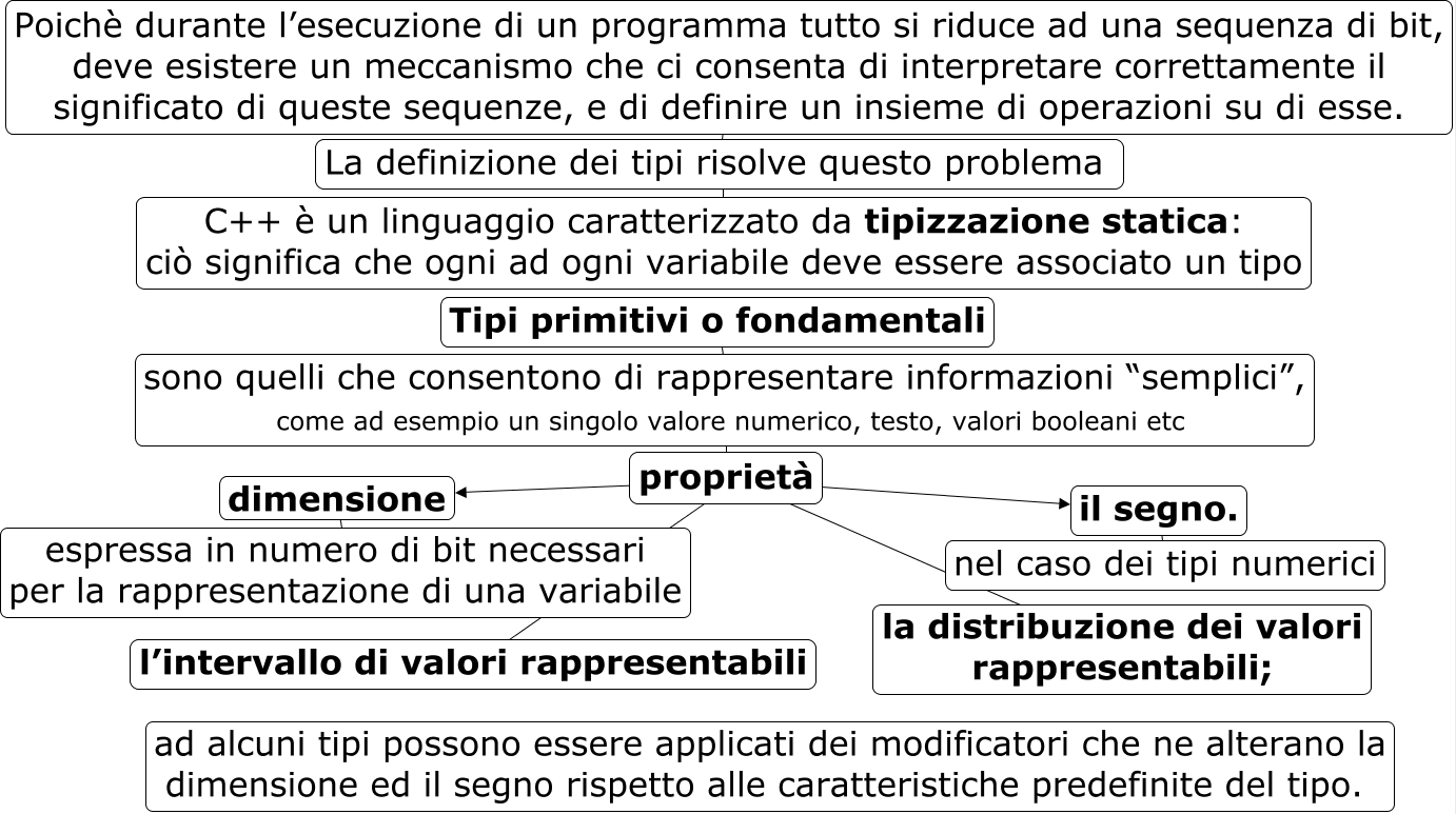Questa Cmap, creata con IHMC CmapTools, contiene informazioni relative a: c++ 6, il segno. ???? nel caso dei tipi numerici, La definizione dei tipi risolve questo problema ???? C++ è un linguaggio caratterizzato da tipizzazione statica: ciò significa che ogni ad ogni variabile deve essere associato un tipo, dimensione ???? espressa in numero di bit necessari per la rappresentazione di una variabile, Tipi primitivi o fondamentali ???? sono quelli che consentono di rappresentare informazioni “semplici�?, come ad esempio un singolo valore numerico, testo, valori booleani etc, Poichè durante l’esecuzione di un programma tutto si riduce ad una sequenza di bit, deve esistere un meccanismo che ci consenta di interpretare correttamente il significato di queste sequenze, e di definire un insieme di operazioni su di esse. ???? La definizione dei tipi risolve questo problema, sono quelli che consentono di rappresentare informazioni “semplici�?, come ad esempio un singolo valore numerico, testo, valori booleani etc ???? proprietà, proprietà ???? l’intervallo di valori rappresentabili, proprietà ???? la distribuzione dei valori rappresentabili;, proprietà ???? il segno., proprietà ???? dimensione