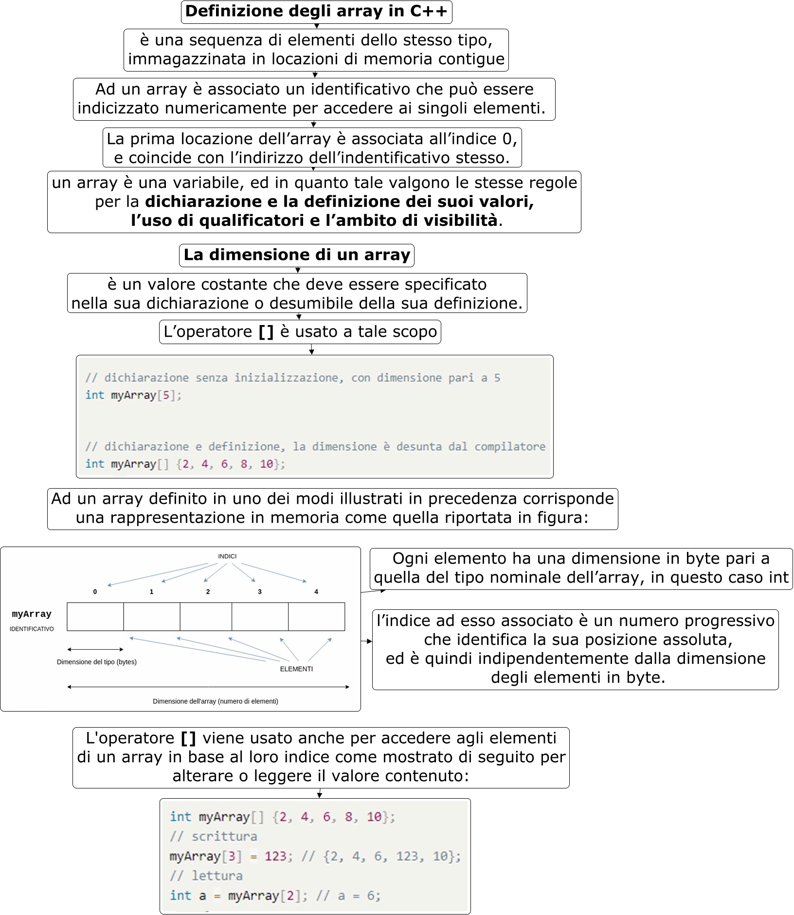Questa Cmap, creata con IHMC CmapTools, contiene informazioni relative a: informatica array C++, ???? l’indice ad esso associato è un numero progressivo che identifica la sua posizione assoluta, ed è quindi indipendentemente dalla dimensione degli elementi in byte., L’operatore [] è usato a tale scopo ????, è una sequenza di elementi dello stesso tipo, immagazzinata in locazioni di memoria contigue ???? Ad un array è associato un identificativo che può essere indicizzato numericamente per accedere ai singoli elementi., Definizione degli array in C++ ???? è una sequenza di elementi dello stesso tipo, immagazzinata in locazioni di memoria contigue, La dimensione di un array ???? è un valore costante che deve essere specificato nella sua dichiarazione o desumibile della sua definizione., L'operatore [] viene usato anche per accedere agli elementi di un array in base al loro indice come mostrato di seguito per alterare o leggere il valore contenuto: ????, La prima locazione dell’array è associata all’indice 0, e coincide con l’indirizzo dell’indentificativo stesso. ???? un array è una variabile, ed in quanto tale valgono le stesse regole per la dichiarazione e la definizione dei suoi valori, l’uso di qualificatori e l’ambito di visibilità., è un valore costante che deve essere specificato nella sua dichiarazione o desumibile della sua definizione. ???? L’operatore [] è usato a tale scopo, ???? Ogni elemento ha una dimensione in byte pari a quella del tipo nominale dell’array, in questo caso int, Ad un array è associato un identificativo che può essere indicizzato numericamente per accedere ai singoli elementi. ???? La prima locazione dell’array è associata all’indice 0, e coincide con l’indirizzo dell’indentificativo stesso.