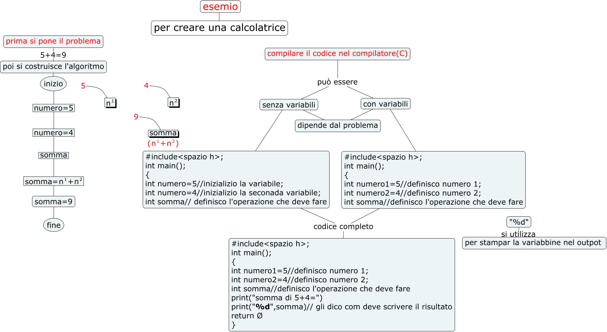 Questa Cmap, creata con IHMC CmapTools, contiene informazioni relative a: informatica 3, compilare il codice nel compilatore(C) può essere con variabili, somma=9 ???? fine, 4 ???? <math xmlns="http://www.w3.org/1998/Math/MathML"> <mrow> <mmultiscripts> <mtext> n </mtext> <none/> <mtext> 2 </mtext> </mmultiscripts> </mrow> </math>, 9 ???? <math xmlns="http://www.w3.org/1998/Math/MathML"> <mtext> somma </mtext> </math>, 5 ???? <math xmlns="http://www.w3.org/1998/Math/MathML"> <mrow> <mmultiscripts> <mtext> n </mtext> <none/> <mtext> 1 </mtext> </mmultiscripts> </mrow> </math>, "%d" si utilizza per stampar la variabbine nel outpot, somma ???? <math xmlns="http://www.w3.org/1998/Math/MathML"> <mrow> <mtext> somma= </mtext> <mmultiscripts> <mtext> n </mtext> <none/> <mtext> 1 </mtext> </mmultiscripts> <mtext> + </mtext> <mmultiscripts> <mtext> n </mtext> <none/> <mtext> 2 </mtext> </mmultiscripts> </mrow> </math>, inizio ???? numero=5, prima si pone il problema 5+4=9 poi si costruisce l'algoritmo, <math xmlns="http://www.w3.org/1998/Math/MathML"> <mtext> somma </mtext> </math> ???? <math xmlns="http://www.w3.org/1998/Math/MathML"> <mrow> <mtext> ( </mtext> <mmultiscripts> <mtext> n </mtext> <none/> <mtext> 1 </mtext> </mmultiscripts> <mtext> + </mtext> <mmultiscripts> <mtext> n </mtext> <none/> <mtext> 2 </mtext> </mmultiscripts> <mtext> ) </mtext> </mrow> </math>, poi si costruisce l'algoritmo ???? inizio, con variabili ???? dipende dal problema, con variabili ???? #include<spazio h> int main(); { int numero1=5//definisco numero 1; int numero2=4//definisco numero 2; int somma//definisco l'operazione che deve fare, #include<spazio h> int main(); { int numero=5//inizializio la variabile; int numero=4//inizializio la seconada variabile; int somma// definisco l'operazione che deve fare codice completo #include<spazio h> int main(); { int numero1=5//definisco numero 1; int numero2=4//definisco numero 2; int somma//definisco l'operazione che deve fare print("somma di 5+4=") print("%d",somma)// gli dico com deve scrivere il risultato return Ø }, numero=4 ???? somma, #include<spazio h> int main(); { int numero1=5//definisco numero 1; int numero2=4//definisco numero 2; int somma//definisco l'operazione che deve fare codice completo #include<spazio h> int main(); { int numero1=5//definisco numero 1; int numero2=4//definisco numero 2; int somma//definisco l'operazione che deve fare print("somma di 5+4=") print("%d",somma)// gli dico com deve scrivere il risultato return Ø }, senza variabili ???? #include<spazio h> int main(); { int numero=5//inizializio la variabile; int numero=4//inizializio la seconada variabile; int somma// definisco l'operazione che deve fare, senza variabili ???? dipende dal problema, <math xmlns="http://www.w3.org/1998/Math/MathML"> <mrow> <mtext> somma= </mtext> <mmultiscripts> <mtext> n </mtext> <none/> <mtext> 1 </mtext> </mmultiscripts> <mtext> + </mtext> <mmultiscripts> <mtext> n </mtext> <none/> <mtext> 2 </mtext> </mmultiscripts> </mrow> </math> ???? somma=9, compilare il codice nel compilatore(C) può essere senza variabili