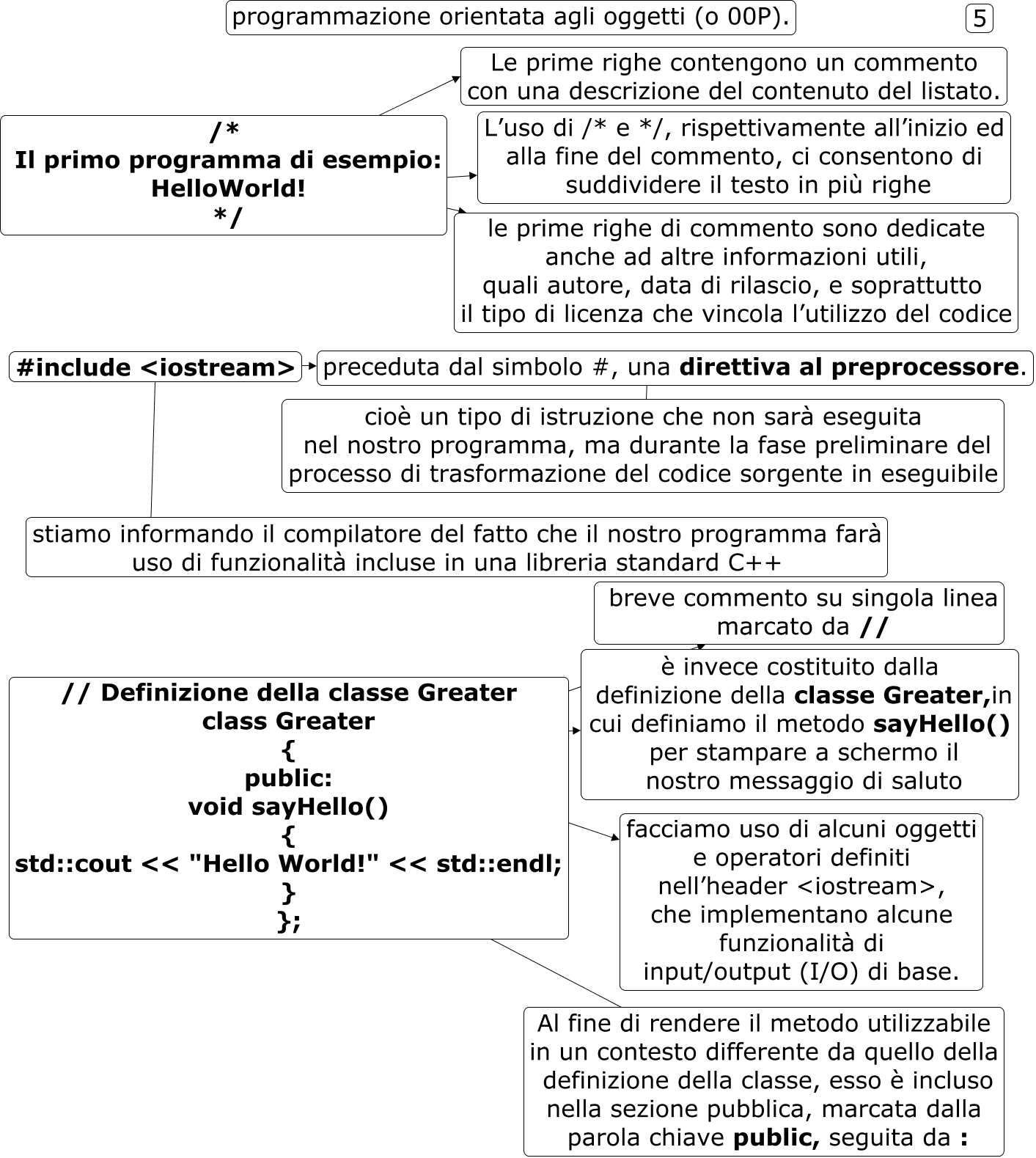Questa Cmap, creata con IHMC CmapTools, contiene informazioni relative a: c++ 5, // Definizione della classe Greater class Greater { public: void sayHello() { std::cout << "Hello World!" << std::endl; } }; ???? Al fine di rendere il metodo utilizzabile in un contesto differente da quello della definizione della classe, esso è incluso nella sezione pubblica, marcata dalla parola chiave public, seguita da :, // Definizione della classe Greater class Greater { public: void sayHello() { std::cout << "Hello World!" << std::endl; } }; ???? facciamo uso di alcuni oggetti e operatori definiti nell’header <iostream>, che implementano alcune funzionalità di input/output (I/O) di base., /* Il primo programma di esempio: HelloWorld! */ ???? le prime righe di commento sono dedicate anche ad altre informazioni utili, quali autore, data di rilascio, e soprattutto il tipo di licenza che vincola l’utilizzo del codice, preceduta dal simbolo #, una direttiva al preprocessore. ???? cioè un tipo di istruzione che non sarà eseguita nel nostro programma, ma durante la fase preliminare del processo di trasformazione del codice sorgente in eseguibile, // Definizione della classe Greater class Greater { public: void sayHello() { std::cout << "Hello World!" << std::endl; } }; ???? breve commento su singola linea marcato da //, #include <iostream> ???? preceduta dal simbolo #, una direttiva al preprocessore., // Definizione della classe Greater class Greater { public: void sayHello() { std::cout << "Hello World!" << std::endl; } }; ???? è invece costituito dalla definizione della classe Greater,in cui definiamo il metodo sayHello() per stampare a schermo il nostro messaggio di saluto, /* Il primo programma di esempio: HelloWorld! */ ???? L’uso di /* e */, rispettivamente all’inizio ed alla fine del commento, ci consentono di suddividere il testo in più righe, #include <iostream> ???? stiamo informando il compilatore del fatto che il nostro programma farà uso di funzionalità incluse in una libreria standard C++, /* Il primo programma di esempio: HelloWorld! */ ???? Le prime righe contengono un commento con una descrizione del contenuto del listato.