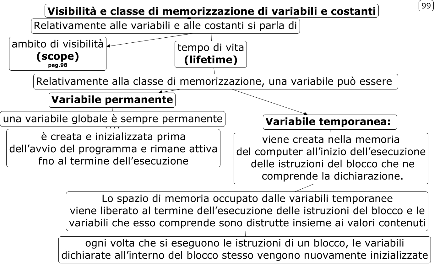 Questa Cmap, creata con IHMC CmapTools, contiene informazioni relative a: 99, viene creata nella memoria del computer all’inizio dell’esecuzione delle istruzioni del blocco che ne comprende la dichiarazione. ???? Lo spazio di memoria occupato dalle variabili temporanee viene liberato al termine dell’esecuzione delle istruzioni del blocco e le variabili che esso comprende sono distrutte insieme ai valori contenuti, tempo di vita (lifetime) ???? Relativamente alla classe di memorizzazione, una variabile può essere, Lo spazio di memoria occupato dalle variabili temporanee viene liberato al termine dell’esecuzione delle istruzioni del blocco e le variabili che esso comprende sono distrutte insieme ai valori contenuti ???? ogni volta che si eseguono le istruzioni di un blocco, le variabili dichiarate all’interno del blocco stesso vengono nuovamente inizializzate, Visibilità e classe di memorizzazione di variabili e costanti ???? Relativamente alle variabili e alle costanti si parla di, Variabile temporanea: ???? viene creata nella memoria del computer all’inizio dell’esecuzione delle istruzioni del blocco che ne comprende la dichiarazione., Relativamente alle variabili e alle costanti si parla di ???? tempo di vita (lifetime), Relativamente alla classe di memorizzazione, una variabile può essere ???? Variabile temporanea:, Variabile permanente ???? una variabile globale è sempre permanente, una variabile globale è sempre permanente ???? è creata e inizializzata prima dell’avvio del programma e rimane attiva fno al termine dell’esecuzione, Relativamente alla classe di memorizzazione, una variabile può essere ???? Variabile permanente, Relativamente alle variabili e alle costanti si parla di ???? ambito di visibilità (scope) pag.98
