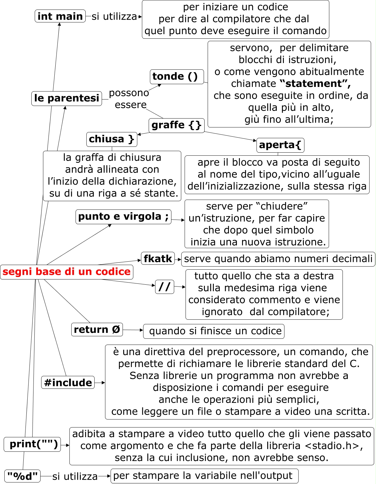 Questa Cmap, creata con IHMC CmapTools, contiene informazioni relative a: informatica 2a, segni base di un codice ???? punto e virgola ;, segni base di un codice ???? le parentesi, fkatk ???? serve quando abiamo numeri decimali, segni base di un codice ???? return Ø, segni base di un codice ???? fkatk, #include ???? è una direttiva del preprocessore, un comando, che permette di richiamare le librerie standard del C. Senza librerie un programma non avrebbe a disposizione i comandi per eseguire anche le operazioni più semplici, come leggere un file o stampare a video una scritta., graffe {} ???? chiusa }, le parentesi possono essere graffe {}, segni base di un codice ???? //, // . tutto quello che sta a destra sulla medesima riga viene considerato commento e viene ignorato dal compilatore;, graffe {} ???? aperta{, segni base di un codice ???? int main, print("") ???? adibita a stampare a video tutto quello che gli viene passato come argomento e che fa parte della libreria <stadio.h>, senza la cui inclusione, non avrebbe senso., int main si utilizza per iniziare un codice per dire al compilatore che dal quel punto deve eseguire il comando, "%d" si utilizza per stampare la variabile nell'output, tonde () ???? servono, per delimitare blocchi di istruzioni, o come vengono abitualmente chiamate “statement�?, che sono eseguite in ordine, da quella più in alto, giù fino all’ultima;, le parentesi possono essere tonde (), chiusa } ???? la graffa di chiusura andrà allineata con l’inizio della dichiarazione, su di una riga a sé stante., aperta{ ???? apre il blocco va posta di seguito al nome del tipo,vicino all’uguale dell’inizializzazione, sulla stessa riga, punto e virgola ; ???? serve per “chiudere�? un’istruzione, per far capire che dopo quel simbolo inizia una nuova istruzione.
