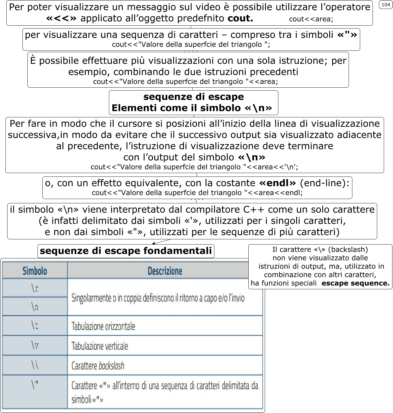 Questa Cmap, creata con IHMC CmapTools, contiene informazioni relative a: 104, o, con un effetto equivalente, con la costante «endl» (end-line): cout<<"Valore della superfcie del triangolo "<<area<<endl; ???? il simbolo «\n» viene interpretato dal compilatore C++ come un solo carattere (è infatti delimitato dai simboli «'», utilizzati per i singoli caratteri, e non dai simboli «"», utilizzati per le sequenze di più caratteri), Per poter visualizzare un messaggio sul video è possibile utilizzare l’operatore «<<» applicato all’oggetto predefnito cout. cout<<area; ???? per visualizzare una sequenza di caratteri – compreso tra i simboli «"» cout<<"Valore della superfcie del triangolo ";, per visualizzare una sequenza di caratteri – compreso tra i simboli «"» cout<<"Valore della superfcie del triangolo "; ???? È possibile effettuare più visualizzazioni con una sola istruzione; per esempio, combinando le due istruzioni precedenti cout<<"Valore della superfcie del triangolo "<<area;, Per fare in modo che il cursore si posizioni all’inizio della linea di visualizzazione successiva,in modo da evitare che il successivo output sia visualizzato adiacente al precedente, l’istruzione di visualizzazione deve terminare con l’output del simbolo «\n» cout<<"Valore della superfcie del triangolo "<<area<<'\n'; ???? o, con un effetto equivalente, con la costante «endl» (end-line): cout<<"Valore della superfcie del triangolo "<<area<<endl;, sequenze di escape fondamentali ????, il simbolo «\n» viene interpretato dal compilatore C++ come un solo carattere (è infatti delimitato dai simboli «'», utilizzati per i singoli caratteri, e non dai simboli «"», utilizzati per le sequenze di più caratteri) ???? sequenze di escape fondamentali, È possibile effettuare più visualizzazioni con una sola istruzione; per esempio, combinando le due istruzioni precedenti cout<<"Valore della superfcie del triangolo "<<area; ???? Per fare in modo che il cursore si posizioni all’inizio della linea di visualizzazione successiva,in modo da evitare che il successivo output sia visualizzato adiacente al precedente, l’istruzione di visualizzazione deve terminare con l’output del simbolo «\n» cout<<"Valore della superfcie del triangolo "<<area<<'\n';