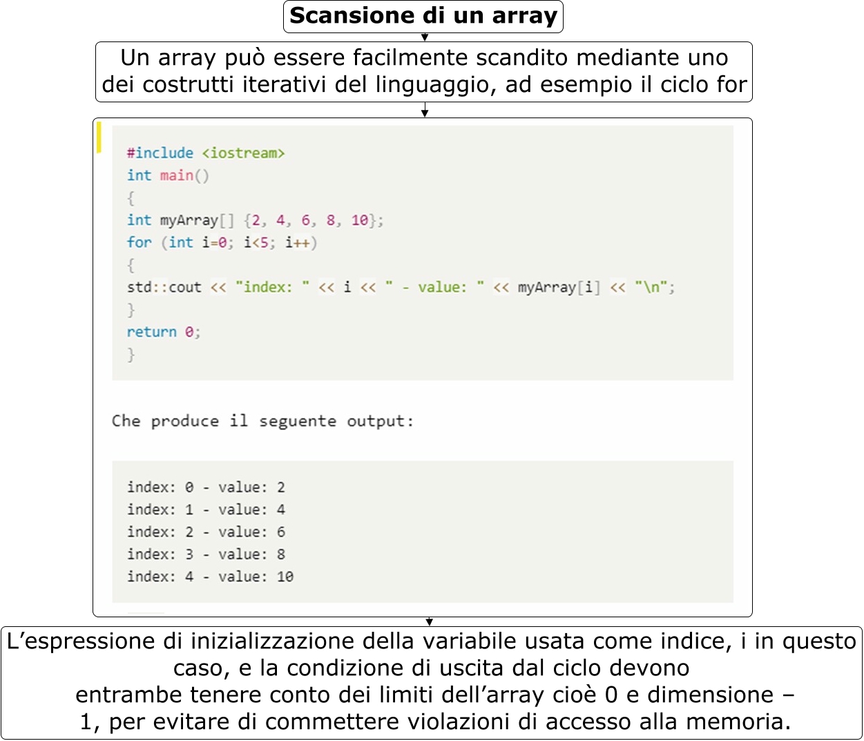 Questa Cmap, creata con IHMC CmapTools, contiene informazioni relative a: informatica array C++ 2, ???? L’espressione di inizializzazione della variabile usata come indice, i in questo caso, e la condizione di uscita dal ciclo devono entrambe tenere conto dei limiti dell’array cioè 0 e dimensione – 1, per evitare di commettere violazioni di accesso alla memoria., Scansione di un array ???? Un array può essere facilmente scandito mediante uno dei costrutti iterativi del linguaggio, ad esempio il ciclo for, Un array può essere facilmente scandito mediante uno dei costrutti iterativi del linguaggio, ad esempio il ciclo for ????