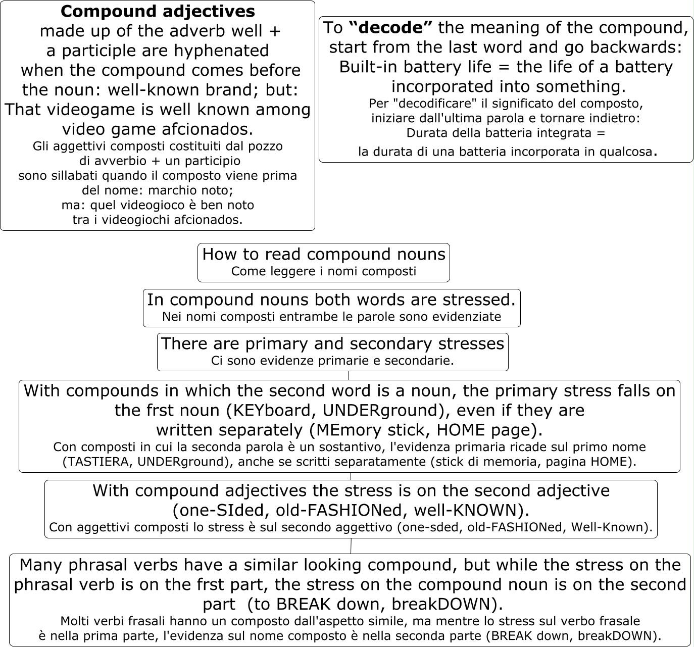 Questa Cmap, creata con IHMC CmapTools, contiene informazioni relative a: 36, With compound adjectives the stress is on the second adjective (one-SIded, old-FASHIONed, well-KNOWN). Con aggettivi composti lo stress è sul secondo aggettivo (one-sded, old-FASHIONed, Well-Known). ???? Many phrasal verbs have a similar looking compound, but while the stress on the phrasal verb is on the frst part, the stress on the compound noun is on the second part (to BREAK down, breakDOWN). Molti verbi frasali hanno un composto dall'aspetto simile, ma mentre lo stress sul verbo frasale è nella prima parte, l'evidenza sul nome composto è nella seconda parte (BREAK down, breakDOWN)., With compounds in which the second word is a noun, the primary stress falls on the frst noun (KEYboard, UNDERground), even if they are written separately (MEmory stick, HOME page). Con composti in cui la seconda parola è un sostantivo, l'evidenza primaria ricade sul primo nome (TASTIERA, UNDERground), anche se scritti separatamente (stick di memoria, pagina HOME). ???? With compound adjectives the stress is on the second adjective (one-SIded, old-FASHIONed, well-KNOWN). Con aggettivi composti lo stress è sul secondo aggettivo (one-sded, old-FASHIONed, Well-Known)., There are primary and secondary stresses Ci sono evidenze primarie e secondarie. ???? With compounds in which the second word is a noun, the primary stress falls on the frst noun (KEYboard, UNDERground), even if they are written separately (MEmory stick, HOME page). Con composti in cui la seconda parola è un sostantivo, l'evidenza primaria ricade sul primo nome (TASTIERA, UNDERground), anche se scritti separatamente (stick di memoria, pagina HOME).