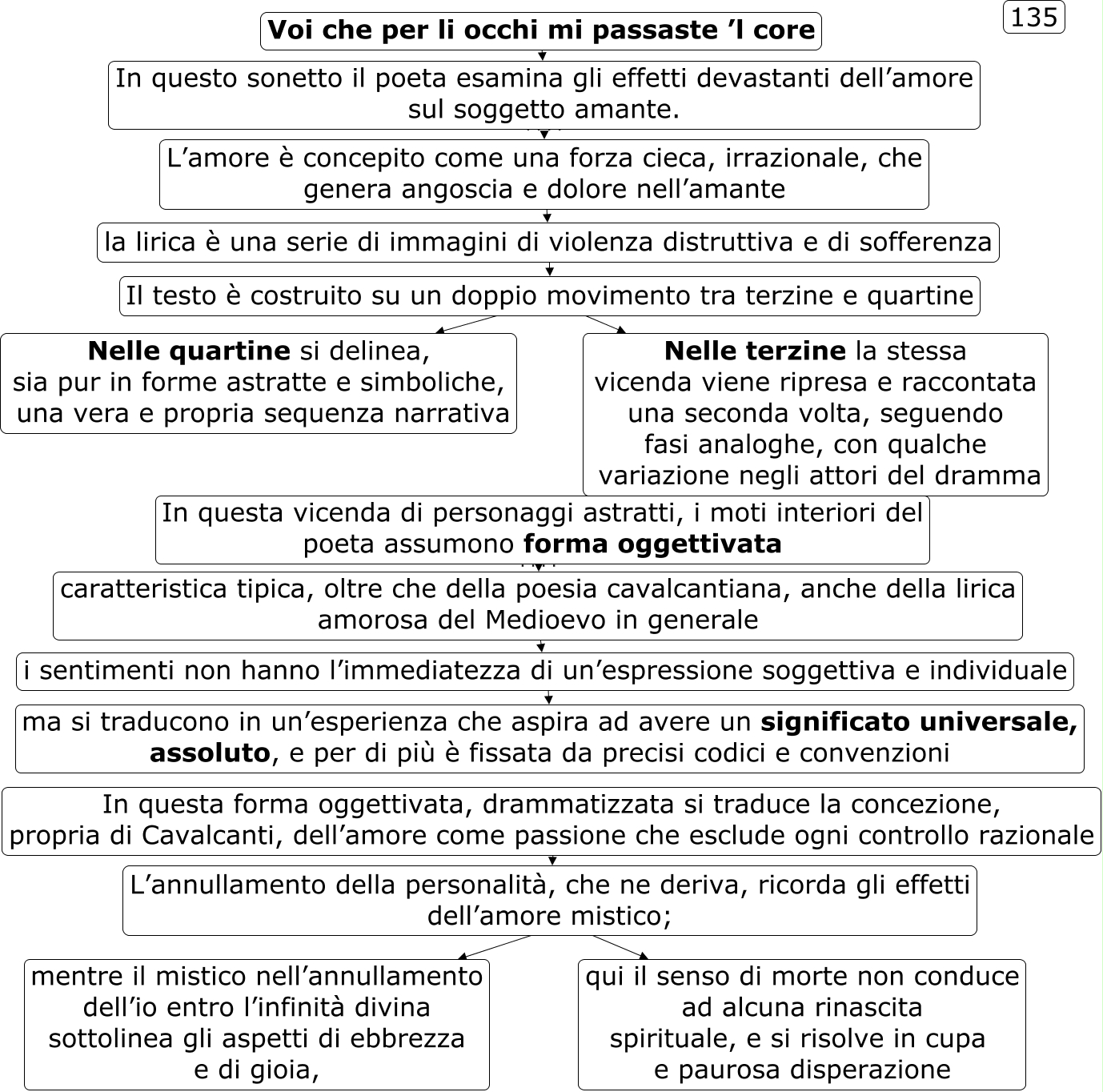 Questa Cmap, creata con IHMC CmapTools, contiene informazioni relative a: 135, L’annullamento della personalità, che ne deriva, ricorda gli effetti dell’amore mistico; ???? qui il senso di morte non conduce ad alcuna rinascita spirituale, e si risolve in cupa e paurosa disperazione, caratteristica tipica, oltre che della poesia cavalcantiana, anche della lirica amorosa del Medioevo in generale ???? i sentimenti non hanno l’immediatezza di un’espressione soggettiva e individuale, In questa forma oggettivata, drammatizzata si traduce la concezione, propria di Cavalcanti, dell’amore come passione che esclude ogni controllo razionale ???? L’annullamento della personalità, che ne deriva, ricorda gli effetti dell’amore mistico;, la lirica è una serie di immagini di violenza distruttiva e di sofferenza ???? Il testo è costruito su un doppio movimento tra terzine e quartine, Voi che per li occhi mi passaste ’l core ???? In questo sonetto il poeta esamina gli effetti devastanti dell’amore sul soggetto amante., L’annullamento della personalità, che ne deriva, ricorda gli effetti dell’amore mistico; ???? mentre il mistico nell’annullamento dell’io entro l’infinità divina sottolinea gli aspetti di ebbrezza e di gioia,, L’amore è concepito come una forza cieca, irrazionale, che genera angoscia e dolore nell’amante ???? la lirica è una serie di immagini di violenza distruttiva e di sofferenza, In questo sonetto il poeta esamina gli effetti devastanti dell’amore sul soggetto amante. ???? L’amore è concepito come una forza cieca, irrazionale, che genera angoscia e dolore nell’amante, In questa vicenda di personaggi astratti, i moti interiori del poeta assumono forma oggettivata ???? caratteristica tipica, oltre che della poesia cavalcantiana, anche della lirica amorosa del Medioevo in generale, Il testo è costruito su un doppio movimento tra terzine e quartine ???? Nelle quartine si delinea, sia pur in forme astratte e simboliche, una vera e propria sequenza narrativa, i sentimenti non hanno l’immediatezza di un’espressione soggettiva e individuale ???? ma si traducono in un’esperienza che aspira ad avere un significato universale, assoluto, e per di più è fissata da precisi codici e convenzioni, Il testo è costruito su un doppio movimento tra terzine e quartine ???? Nelle terzine la stessa vicenda viene ripresa e raccontata una seconda volta, seguendo fasi analoghe, con qualche variazione negli attori del dramma