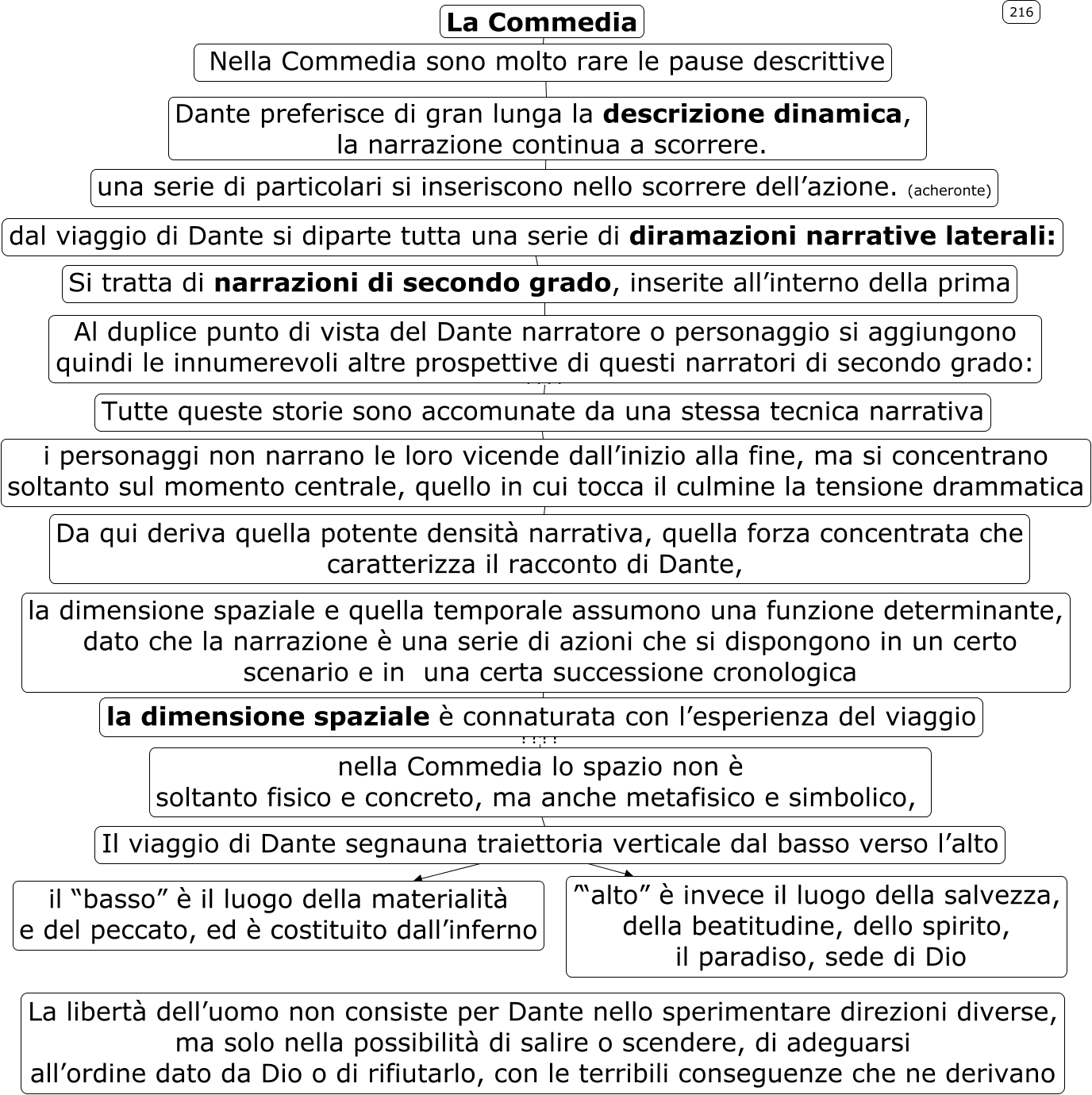 Questa Cmap, creata con IHMC CmapTools, contiene informazioni relative a: 217, Dante preferisce di gran lunga la descrizione dinamica, la narrazione continua a scorrere. ???? una serie di particolari si inseriscono nello scorrere dell’azione. (acheronte), Il viaggio di Dante segnauna traiettoria verticale dal basso verso l’alto ???? ’“alto�? è invece il luogo della salvezza, della beatitudine, dello spirito, il paradiso, sede di Dio, Tutte queste storie sono accomunate da una stessa tecnica narrativa ???? i personaggi non narrano le loro vicende dall’inizio alla fine, ma si concentrano soltanto sul momento centrale, quello in cui tocca il culmine la tensione drammatica, Si tratta di narrazioni di secondo grado, inserite all’interno della prima ???? Al duplice punto di vista del Dante narratore o personaggio si aggiungono quindi le innumerevoli altre prospettive di questi narratori di secondo grado:, nella Commedia lo spazio non è soltanto fisico e concreto, ma anche metafisico e simbolico, ???? Il viaggio di Dante segnauna traiettoria verticale dal basso verso l’alto, la dimensione spaziale e quella temporale assumono una funzione determinante, dato che la narrazione è una serie di azioni che si dispongono in un certo scenario e in una certa successione cronologica ???? la dimensione spaziale è connaturata con l’esperienza del viaggio, Il viaggio di Dante segnauna traiettoria verticale dal basso verso l’alto ???? il “basso�? è il luogo della materialità e del peccato, ed è costituito dall’inferno, dal viaggio di Dante si diparte tutta una serie di diramazioni narrative laterali: ???? Si tratta di narrazioni di secondo grado, inserite all’interno della prima, La Commedia ???? Nella Commedia sono molto rare le pause descrittive, i personaggi non narrano le loro vicende dall’inizio alla fine, ma si concentrano soltanto sul momento centrale, quello in cui tocca il culmine la tensione drammatica ???? Da qui deriva quella potente densità narrativa, quella forza concentrata che caratterizza il racconto di Dante,, la dimensione spaziale è connaturata con l’esperienza del viaggio ???? nella Commedia lo spazio non è soltanto fisico e concreto, ma anche metafisico e simbolico,, Al duplice punto di vista del Dante narratore o personaggio si aggiungono quindi le innumerevoli altre prospettive di questi narratori di secondo grado: ???? Tutte queste storie sono accomunate da una stessa tecnica narrativa, Nella Commedia sono molto rare le pause descrittive ???? Dante preferisce di gran lunga la descrizione dinamica, la narrazione continua a scorrere.