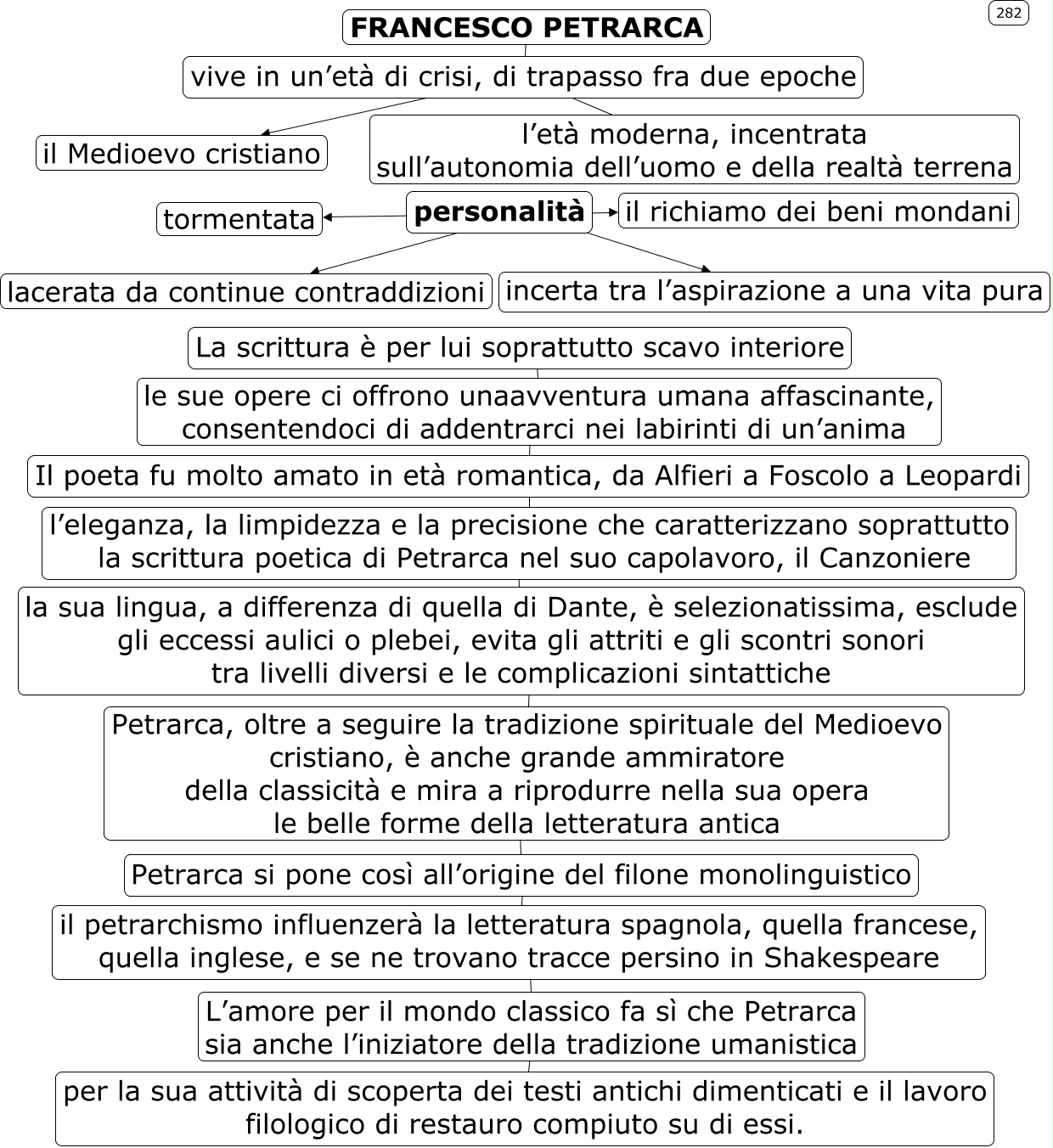Questa Cmap, creata con IHMC CmapTools, contiene informazioni relative a: 282, La scrittura è per lui soprattutto scavo interiore ???? le sue opere ci offrono unaavventura umana affascinante, consentendoci di addentrarci nei labirinti di un’anima, la sua lingua, a differenza di quella di Dante, è selezionatissima, esclude gli eccessi aulici o plebei, evita gli attriti e gli scontri sonori tra livelli diversi e le complicazioni sintattiche ???? Petrarca, oltre a seguire la tradizione spirituale del Medioevo cristiano, è anche grande ammiratore della classicità e mira a riprodurre nella sua opera le belle forme della letteratura antica, L’amore per il mondo classico fa sì che Petrarca sia anche l’iniziatore della tradizione umanistica ???? per la sua attività di scoperta dei testi antichi dimenticati e il lavoro filologico di restauro compiuto su di essi., personalità ???? incerta tra l’aspirazione a una vita pura, FRANCESCO PETRARCA ???? vive in un’età di crisi, di trapasso fra due epoche, personalità ???? il richiamo dei beni mondani, Petrarca, oltre a seguire la tradizione spirituale del Medioevo cristiano, è anche grande ammiratore della classicità e mira a riprodurre nella sua opera le belle forme della letteratura antica ???? Petrarca si pone così all’origine del filone monolinguistico, l’eleganza, la limpidezza e la precisione che caratterizzano soprattutto la scrittura poetica di Petrarca nel suo capolavoro, il Canzoniere ???? la sua lingua, a differenza di quella di Dante, è selezionatissima, esclude gli eccessi aulici o plebei, evita gli attriti e gli scontri sonori tra livelli diversi e le complicazioni sintattiche, Petrarca si pone così all’origine del filone monolinguistico ???? il petrarchismo influenzerà la letteratura spagnola, quella francese, quella inglese, e se ne trovano tracce persino in Shakespeare, personalità ???? tormentata, vive in un’età di crisi, di trapasso fra due epoche ???? l’età moderna, incentrata sull’autonomia dell’uomo e della realtà terrena, le sue opere ci offrono unaavventura umana affascinante, consentendoci di addentrarci nei labirinti di un’anima ???? Il poeta fu molto amato in età romantica, da Alfieri a Foscolo a Leopardi, Il poeta fu molto amato in età romantica, da Alfieri a Foscolo a Leopardi ???? l’eleganza, la limpidezza e la precisione che caratterizzano soprattutto la scrittura poetica di Petrarca nel suo capolavoro, il Canzoniere, il petrarchismo influenzerà la letteratura spagnola, quella francese, quella inglese, e se ne trovano tracce persino in Shakespeare ???? L’amore per il mondo classico fa sì che Petrarca sia anche l’iniziatore della tradizione umanistica, vive in un’età di crisi, di trapasso fra due epoche ???? il Medioevo cristiano, personalità ???? lacerata da continue contraddizioni