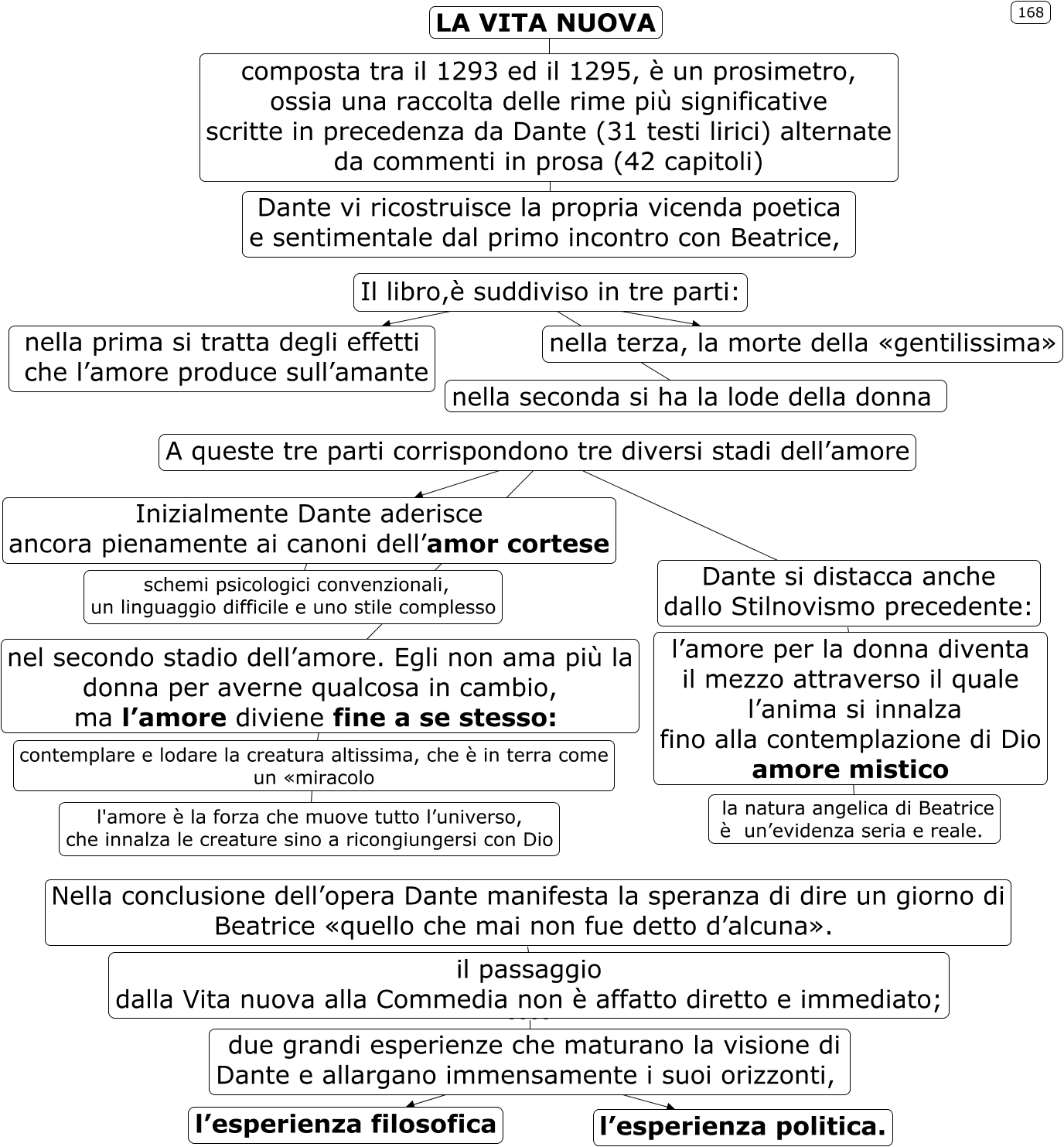 Questa Cmap, creata con IHMC CmapTools, contiene informazioni relative a: 168, il passaggio dalla Vita nuova alla Commedia non è affatto diretto e immediato; ???? due grandi esperienze che maturano la visione di Dante e allargano immensamente i suoi orizzonti,, Dante si distacca anche dallo Stilnovismo precedente: ???? l’amore per la donna diventa il mezzo attraverso il quale l’anima si innalza fino alla contemplazione di Dio amore mistico, Il libro,è suddiviso in tre parti: ???? nella seconda si ha la lode della donna, Il libro,è suddiviso in tre parti: ???? nella prima si tratta degli effetti che l’amore produce sull’amante, due grandi esperienze che maturano la visione di Dante e allargano immensamente i suoi orizzonti, ???? l’esperienza filosofica, nel secondo stadio dell’amore. Egli non ama più la donna per averne qualcosa in cambio, ma l’amore diviene fine a se stesso: ???? contemplare e lodare la creatura altissima, che è in terra come un «miracolo, LA VITA NUOVA ???? composta tra il 1293 ed il 1295, è un prosimetro, ossia una raccolta delle rime più significative scritte in precedenza da Dante (31 testi lirici) alternate da commenti in prosa (42 capitoli), A queste tre parti corrispondono tre diversi stadi dell’amore ???? nel secondo stadio dell’amore. Egli non ama più la donna per averne qualcosa in cambio, ma l’amore diviene fine a se stesso:, composta tra il 1293 ed il 1295, è un prosimetro, ossia una raccolta delle rime più significative scritte in precedenza da Dante (31 testi lirici) alternate da commenti in prosa (42 capitoli) ???? Dante vi ricostruisce la propria vicenda poetica e sentimentale dal primo incontro con Beatrice,, Inizialmente Dante aderisce ancora pienamente ai canoni dell’amor cortese ???? schemi psicologici convenzionali, un linguaggio difficile e uno stile complesso, A queste tre parti corrispondono tre diversi stadi dell’amore ???? Inizialmente Dante aderisce ancora pienamente ai canoni dell’amor cortese, due grandi esperienze che maturano la visione di Dante e allargano immensamente i suoi orizzonti, ???? l’esperienza politica., l’amore per la donna diventa il mezzo attraverso il quale l’anima si innalza fino alla contemplazione di Dio amore mistico ???? la natura angelica di Beatrice è un’evidenza seria e reale., Il libro,è suddiviso in tre parti: ???? nella terza, la morte della «gentilissima», Nella conclusione dell’opera Dante manifesta la speranza di dire un giorno di Beatrice «quello che mai non fue detto d’alcuna». ???? il passaggio dalla Vita nuova alla Commedia non è affatto diretto e immediato;, A queste tre parti corrispondono tre diversi stadi dell’amore ???? Dante si distacca anche dallo Stilnovismo precedente:, contemplare e lodare la creatura altissima, che è in terra come un «miracolo ???? l'amore è la forza che muove tutto l’universo, che innalza le creature sino a ricongiungersi con Dio