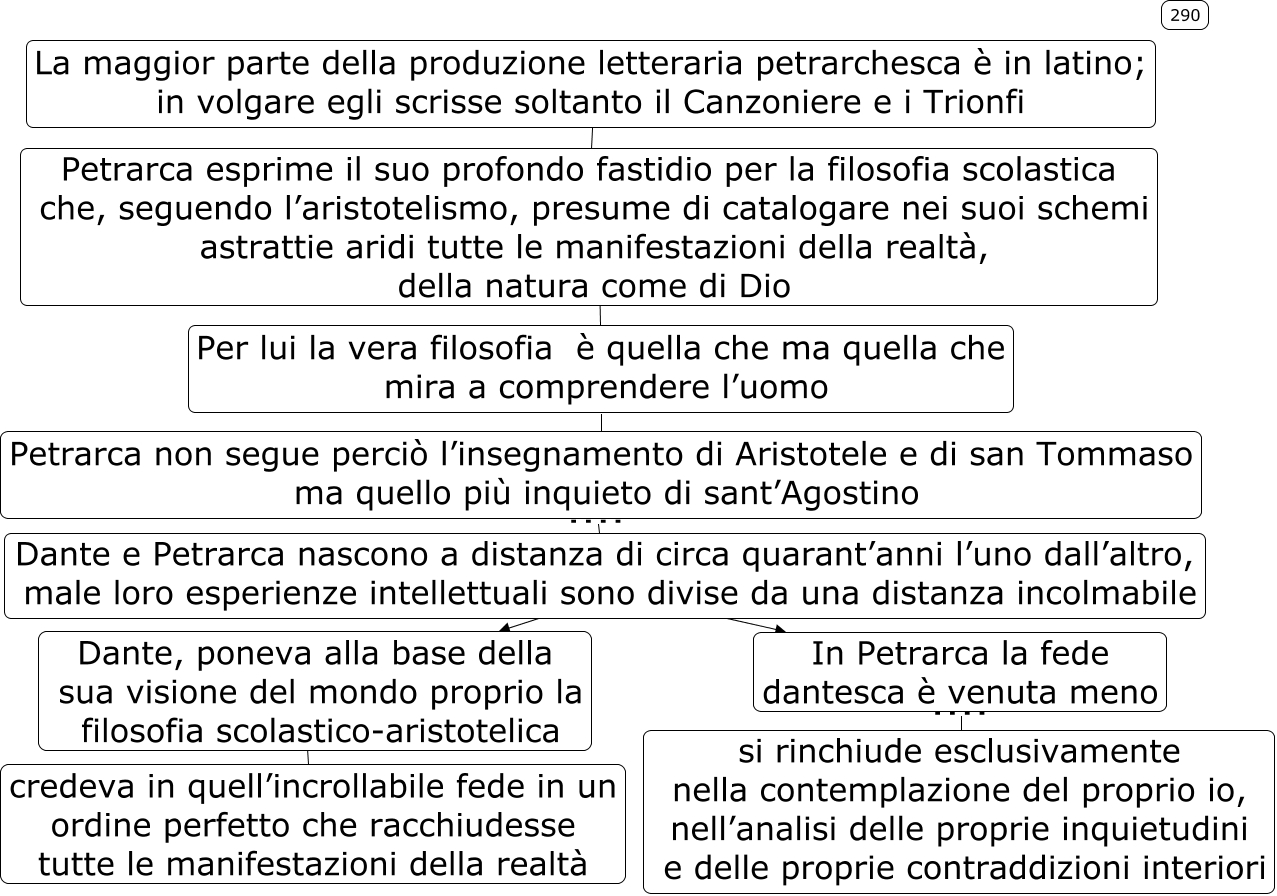 Questa Cmap, creata con IHMC CmapTools, contiene informazioni relative a: 290, In Petrarca la fede dantesca è venuta meno ???? si rinchiude esclusivamente nella contemplazione del proprio io, nell’analisi delle proprie inquietudini e delle proprie contraddizioni interiori, Dante, poneva alla base della sua visione del mondo proprio la filosofia scolastico-aristotelica ???? credeva in quell’incrollabile fede in un ordine perfetto che racchiudesse tutte le manifestazioni della realtà, Per lui la vera filosofia è quella che ma quella che mira a comprendere l’uomo ???? Petrarca non segue perciò l’insegnamento di Aristotele e di san Tommaso ma quello più inquieto di sant’Agostino, Petrarca esprime il suo profondo fastidio per la filosofia scolastica che, seguendo l’aristotelismo, presume di catalogare nei suoi schemi astrattie aridi tutte le manifestazioni della realtà, della natura come di Dio ???? Per lui la vera filosofia è quella che ma quella che mira a comprendere l’uomo, La maggior parte della produzione letteraria petrarchesca è in latino; in volgare egli scrisse soltanto il Canzoniere e i Trionfi ???? Petrarca esprime il suo profondo fastidio per la filosofia scolastica che, seguendo l’aristotelismo, presume di catalogare nei suoi schemi astrattie aridi tutte le manifestazioni della realtà, della natura come di Dio, Petrarca non segue perciò l’insegnamento di Aristotele e di san Tommaso ma quello più inquieto di sant’Agostino ???? Dante e Petrarca nascono a distanza di circa quarant’anni l’uno dall’altro, male loro esperienze intellettuali sono divise da una distanza incolmabile, Dante e Petrarca nascono a distanza di circa quarant’anni l’uno dall’altro, male loro esperienze intellettuali sono divise da una distanza incolmabile ???? In Petrarca la fede dantesca è venuta meno, Dante e Petrarca nascono a distanza di circa quarant’anni l’uno dall’altro, male loro esperienze intellettuali sono divise da una distanza incolmabile ???? Dante, poneva alla base della sua visione del mondo proprio la filosofia scolastico-aristotelica