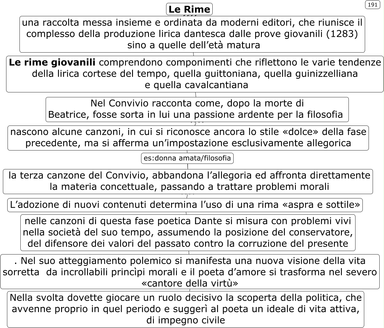 Questa Cmap, creata con IHMC CmapTools, contiene informazioni relative a: 191, la terza canzone del Convivio, abbandona l’allegoria ed affronta direttamente la materia concettuale, passando a trattare problemi morali ???? L’adozione di nuovi contenuti determina l’uso di una rima «aspra e sottile», . Nel suo atteggiamento polemico si manifesta una nuova visione della vita sorretta da incrollabili princìpi morali e il poeta d’amore si trasforma nel severo «cantore della virtù» ???? Nella svolta dovette giocare un ruolo decisivo la scoperta della politica, che avvenne proprio in quel periodo e suggerì al poeta un ideale di vita attiva, di impegno civile, una raccolta messa insieme e ordinata da moderni editori, che riunisce il complesso della produzione lirica dantesca dalle prove giovanili (1283) sino a quelle dell’età matura ???? Le rime giovanili comprendono componimenti che riflettono le varie tendenze della lirica cortese del tempo, quella guittoniana, quella guinizzelliana e quella cavalcantiana, L’adozione di nuovi contenuti determina l’uso di una rima «aspra e sottile» ???? nelle canzoni di questa fase poetica Dante si misura con problemi vivi nella società del suo tempo, assumendo la posizione del conservatore, del difensore dei valori del passato contro la corruzione del presente, Le rime giovanili comprendono componimenti che riflettono le varie tendenze della lirica cortese del tempo, quella guittoniana, quella guinizzelliana e quella cavalcantiana ???? Nel Convivio racconta come, dopo la morte di Beatrice, fosse sorta in lui una passione ardente per la filosofia, nelle canzoni di questa fase poetica Dante si misura con problemi vivi nella società del suo tempo, assumendo la posizione del conservatore, del difensore dei valori del passato contro la corruzione del presente ???? . Nel suo atteggiamento polemico si manifesta una nuova visione della vita sorretta da incrollabili princìpi morali e il poeta d’amore si trasforma nel severo «cantore della virtù», es:donna amata/filosofia ???? la terza canzone del Convivio, abbandona l’allegoria ed affronta direttamente la materia concettuale, passando a trattare problemi morali, es:donna amata/filosofia ???? la terza canzone del Convivio, abbandona l’allegoria ed affronta direttamente la materia concettuale, passando a trattare problemi morali, Nel Convivio racconta come, dopo la morte di Beatrice, fosse sorta in lui una passione ardente per la filosofia ???? nascono alcune canzoni, in cui si riconosce ancora lo stile «dolce» della fase precedente, ma si afferma un’impostazione esclusivamente allegorica, Le Rime ???? una raccolta messa insieme e ordinata da moderni editori, che riunisce il complesso della produzione lirica dantesca dalle prove giovanili (1283) sino a quelle dell’età matura, nascono alcune canzoni, in cui si riconosce ancora lo stile «dolce» della fase precedente, ma si afferma un’impostazione esclusivamente allegorica ???? es:donna amata/filosofia