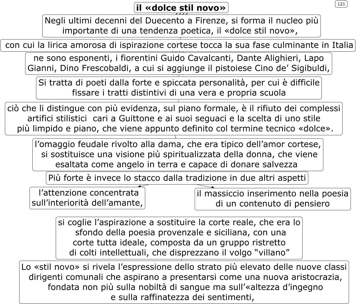 Questa Cmap, creata con IHMC CmapTools, contiene informazioni relative a: 122, si coglie l’aspirazione a sostituire la corte reale, che era lo sfondo della poesia provenzale e siciliana, con una corte tutta ideale, composta da un gruppo ristretto di colti intellettuali, che disprezzano il volgo “villano�? ???? Lo «stil novo» si rivela l’espressione dello strato più elevato delle nuove classi dirigenti comunali che aspirano a presentarsi come una nuova aristocrazia, fondata non più sulla nobiltà di sangue ma sull’«altezza d’ingegno e sulla raffinatezza dei sentimenti,, con cui la lirica amorosa di ispirazione cortese tocca la sua fase culminante in Italia ???? ne sono esponenti, i fiorentini Guido Cavalcanti, Dante Alighieri, Lapo Gianni, Dino Frescobaldi, a cui si aggiunge il pistoiese Cino de’ Sigibuldi,, Negli ultimi decenni del Duecento a Firenze, si forma il nucleo più importante di una tendenza poetica, il «dolce stil novo», ???? con cui la lirica amorosa di ispirazione cortese tocca la sua fase culminante in Italia, Più forte è invece lo stacco dalla tradizione in due altri aspetti ???? il massiccio inserimento nella poesia di un contenuto di pensiero, l’omaggio feudale rivolto alla dama, che era tipico dell’amor cortese, si sostituisce una visione più spiritualizzata della donna, che viene esaltata come angelo in terra e capace di donare salvezza ???? Più forte è invece lo stacco dalla tradizione in due altri aspetti, ne sono esponenti, i fiorentini Guido Cavalcanti, Dante Alighieri, Lapo Gianni, Dino Frescobaldi, a cui si aggiunge il pistoiese Cino de’ Sigibuldi, ???? Si tratta di poeti dalla forte e spiccata personalità, per cui è difficile fissare i tratti distintivi di una vera e propria scuola, Si tratta di poeti dalla forte e spiccata personalità, per cui è difficile fissare i tratti distintivi di una vera e propria scuola ???? ciò che li distingue con più evidenza, sul piano formale, è il rifiuto dei complessi artifici stilistici cari a Guittone e ai suoi seguaci e la scelta di uno stile più limpido e piano, che viene appunto definito col termine tecnico «dolce»., Più forte è invece lo stacco dalla tradizione in due altri aspetti ???? l’attenzione concentrata sull’interiorità dell’amante,, il «dolce stil novo» ???? Negli ultimi decenni del Duecento a Firenze, si forma il nucleo più importante di una tendenza poetica, il «dolce stil novo»,, ciò che li distingue con più evidenza, sul piano formale, è il rifiuto dei complessi artifici stilistici cari a Guittone e ai suoi seguaci e la scelta di uno stile più limpido e piano, che viene appunto definito col termine tecnico «dolce». ???? l’omaggio feudale rivolto alla dama, che era tipico dell’amor cortese, si sostituisce una visione più spiritualizzata della donna, che viene esaltata come angelo in terra e capace di donare salvezza