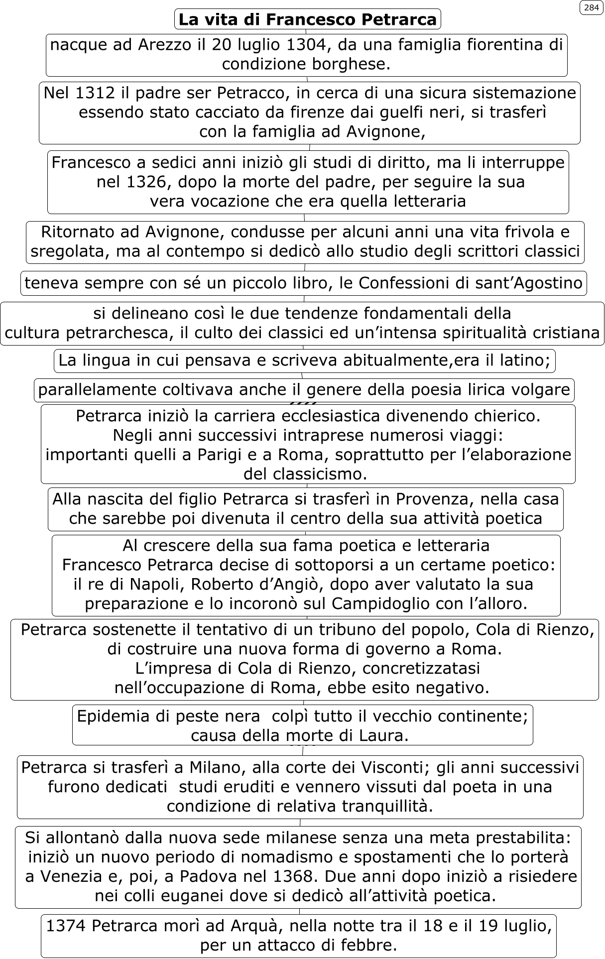 Questa Cmap, creata con IHMC CmapTools, contiene informazioni relative a: petrarca vita, Petrarca sostenette il tentativo di un tribuno del popolo, Cola di Rienzo, di costruire una nuova forma di governo a Roma. L’impresa di Cola di Rienzo, concretizzatasi nell’occupazione di Roma, ebbe esito negativo. ???? Epidemia di peste nera colpì tutto il vecchio continente; causa della morte di Laura., si delineano così le due tendenze fondamentali della cultura petrarchesca, il culto dei classici ed un’intensa spiritualità cristiana ???? La lingua in cui pensava e scriveva abitualmente,era il latino;, La vita di Francesco Petrarca ???? nacque ad Arezzo il 20 luglio 1304, da una famiglia fiorentina di condizione borghese., Petrarca iniziò la carriera ecclesiastica divenendo chierico. Negli anni successivi intraprese numerosi viaggi: importanti quelli a Parigi e a Roma, soprattutto per l’elaborazione del classicismo. ???? Alla nascita del figlio Petrarca si trasferì in Provenza, nella casa che sarebbe poi divenuta il centro della sua attività poetica, Alla nascita del figlio Petrarca si trasferì in Provenza, nella casa che sarebbe poi divenuta il centro della sua attività poetica ???? Al crescere della sua fama poetica e letteraria Francesco Petrarca decise di sottoporsi a un certame poetico: il re di Napoli, Roberto d’Angiò, dopo aver valutato la sua preparazione e lo incoronò sul Campidoglio con l’alloro., La lingua in cui pensava e scriveva abitualmente,era il latino; ???? parallelamente coltivava anche il genere della poesia lirica volgare, Nel 1312 il padre ser Petracco, in cerca di una sicura sistemazione essendo stato cacciato da firenze dai guelfi neri, si trasferì con la famiglia ad Avignone, ???? Francesco a sedici anni iniziò gli studi di diritto, ma li interruppe nel 1326, dopo la morte del padre, per seguire la sua vera vocazione che era quella letteraria, Ritornato ad Avignone, condusse per alcuni anni una vita frivola e sregolata, ma al contempo si dedicò allo studio degli scrittori classici ???? teneva sempre con sé un piccolo libro, le Confessioni di sant’Agostino, Petrarca si trasferì a Milano, alla corte dei Visconti; gli anni successivi furono dedicati studi eruditi e vennero vissuti dal poeta in una condizione di relativa tranquillità. ???? Si allontanò dalla nuova sede milanese senza una meta prestabilita: iniziò un nuovo periodo di nomadismo e spostamenti che lo porterà a Venezia e, poi, a Padova nel 1368. Due anni dopo iniziò a risiedere nei colli euganei dove si dedicò all’attività poetica., parallelamente coltivava anche il genere della poesia lirica volgare ???? Petrarca iniziò la carriera ecclesiastica divenendo chierico. Negli anni successivi intraprese numerosi viaggi: importanti quelli a Parigi e a Roma, soprattutto per l’elaborazione del classicismo., Francesco a sedici anni iniziò gli studi di diritto, ma li interruppe nel 1326, dopo la morte del padre, per seguire la sua vera vocazione che era quella letteraria ???? Ritornato ad Avignone, condusse per alcuni anni una vita frivola e sregolata, ma al contempo si dedicò allo studio degli scrittori classici, Epidemia di peste nera colpì tutto il vecchio continente; causa della morte di Laura. ???? Petrarca si trasferì a Milano, alla corte dei Visconti; gli anni successivi furono dedicati studi eruditi e vennero vissuti dal poeta in una condizione di relativa tranquillità., Si allontanò dalla nuova sede milanese senza una meta prestabilita: iniziò un nuovo periodo di nomadismo e spostamenti che lo porterà a Venezia e, poi, a Padova nel 1368. Due anni dopo iniziò a risiedere nei colli euganei dove si dedicò all’attività poetica. ???? 1374 Petrarca morì ad Arquà, nella notte tra il 18 e il 19 luglio, per un attacco di febbre., Al crescere della sua fama poetica e letteraria Francesco Petrarca decise di sottoporsi a un certame poetico: il re di Napoli, Roberto d’Angiò, dopo aver valutato la sua preparazione e lo incoronò sul Campidoglio con l’alloro. ???? Petrarca sostenette il tentativo di un tribuno del popolo, Cola di Rienzo, di costruire una nuova forma di governo a Roma. L’impresa di Cola di Rienzo, concretizzatasi nell’occupazione di Roma, ebbe esito negativo., nacque ad Arezzo il 20 luglio 1304, da una famiglia fiorentina di condizione borghese. ???? Nel 1312 il padre ser Petracco, in cerca di una sicura sistemazione essendo stato cacciato da firenze dai guelfi neri, si trasferì con la famiglia ad Avignone,, teneva sempre con sé un piccolo libro, le Confessioni di sant’Agostino ???? si delineano così le due tendenze fondamentali della cultura petrarchesca, il culto dei classici ed un’intensa spiritualità cristiana