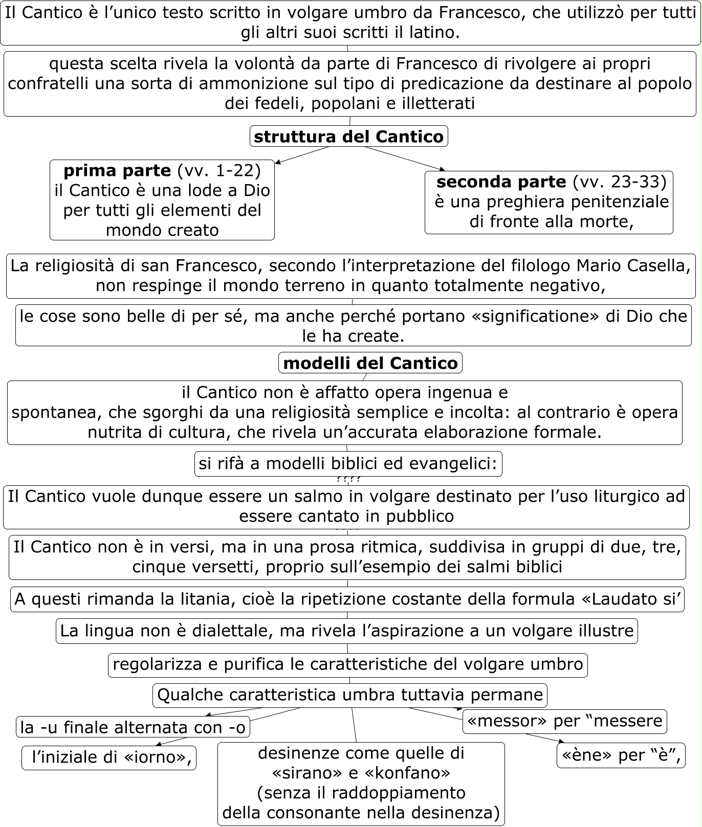 Questa Cmap, creata con IHMC CmapTools, contiene informazioni relative a: 89, regolarizza e purifica le caratteristiche del volgare umbro ???? Qualche caratteristica umbra tuttavia permane, Qualche caratteristica umbra tuttavia permane ???? la -u finale alternata con -o, Il Cantico vuole dunque essere un salmo in volgare destinato per l’uso liturgico ad essere cantato in pubblico ???? Il Cantico non è in versi, ma in una prosa ritmica, suddivisa in gruppi di due, tre, cinque versetti, proprio sull’esempio dei salmi biblici, modelli del Cantico ???? il Cantico non è affatto opera ingenua e spontanea, che sgorghi da una religiosità semplice e incolta: al contrario è opera nutrita di cultura, che rivela un’accurata elaborazione formale., Qualche caratteristica umbra tuttavia permane ???? «messor» per “messere, struttura del Cantico ???? seconda parte (vv. 23-33) è una preghiera penitenziale di fronte alla morte,, questa scelta rivela la volontà da parte di Francesco di rivolgere ai propri confratelli una sorta di ammonizione sul tipo di predicazione da destinare al popolo dei fedeli, popolani e illetterati ???? struttura del Cantico, Il Cantico non è in versi, ma in una prosa ritmica, suddivisa in gruppi di due, tre, cinque versetti, proprio sull’esempio dei salmi biblici ???? A questi rimanda la litania, cioè la ripetizione costante della formula «Laudato si’, struttura del Cantico ???? prima parte (vv. 1-22) il Cantico è una lode a Dio per tutti gli elementi del mondo creato, il Cantico non è affatto opera ingenua e spontanea, che sgorghi da una religiosità semplice e incolta: al contrario è opera nutrita di cultura, che rivela un’accurata elaborazione formale. ???? si rifà a modelli biblici ed evangelici:, Qualche caratteristica umbra tuttavia permane ???? l’iniziale di «iorno»,, La lingua non è dialettale, ma rivela l’aspirazione a un volgare illustre ???? regolarizza e purifica le caratteristiche del volgare umbro, A questi rimanda la litania, cioè la ripetizione costante della formula «Laudato si’ ???? La lingua non è dialettale, ma rivela l’aspirazione a un volgare illustre, si rifà a modelli biblici ed evangelici: ???? Il Cantico vuole dunque essere un salmo in volgare destinato per l’uso liturgico ad essere cantato in pubblico, Il Cantico è l’unico testo scritto in volgare umbro da Francesco, che utilizzò per tutti gli altri suoi scritti il latino. ???? questa scelta rivela la volontà da parte di Francesco di rivolgere ai propri confratelli una sorta di ammonizione sul tipo di predicazione da destinare al popolo dei fedeli, popolani e illetterati, Qualche caratteristica umbra tuttavia permane ???? desinenze come quelle di «sirano» e «konfano» (senza il raddoppiamento della consonante nella desinenza), La religiosità di san Francesco, secondo l’interpretazione del filologo Mario Casella, non respinge il mondo terreno in quanto totalmente negativo, ???? le cose sono belle di per sé, ma anche perché portano «significatione» di Dio che le ha create., Qualche caratteristica umbra tuttavia permane ???? «ène» per “è�?,
