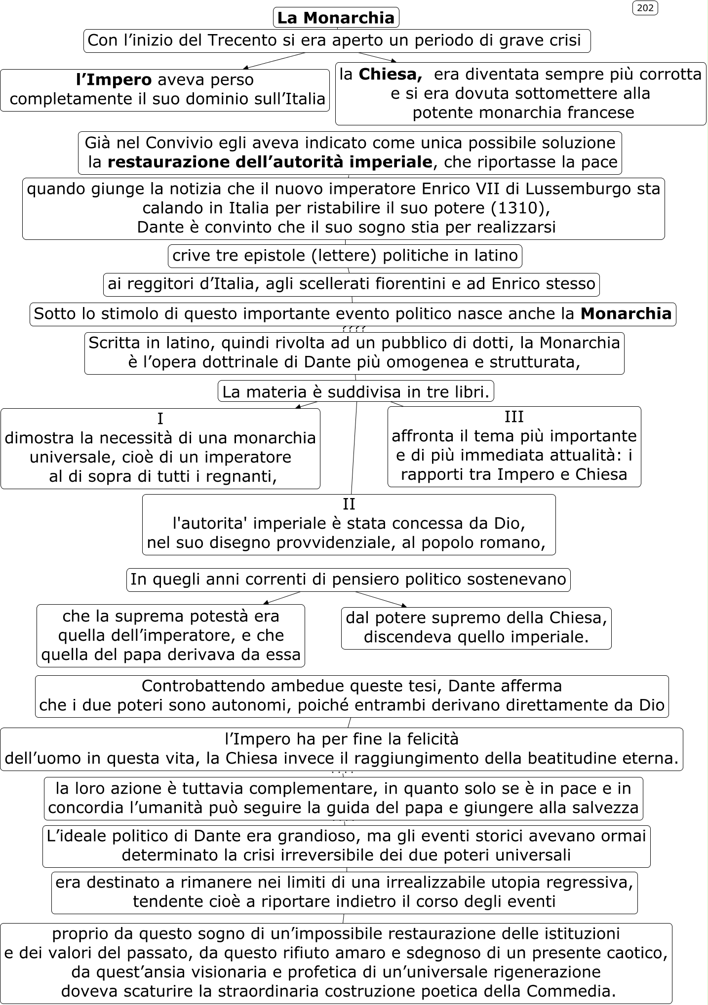 Questa Cmap, creata con IHMC CmapTools, contiene informazioni relative a: 202, quando giunge la notizia che il nuovo imperatore Enrico VII di Lussemburgo sta calando in Italia per ristabilire il suo potere (1310), Dante è convinto che il suo sogno stia per realizzarsi ???? crive tre epistole (lettere) politiche in latino, crive tre epistole (lettere) politiche in latino ???? ai reggitori d’Italia, agli scellerati fiorentini e ad Enrico stesso, La Monarchia ???? Con l’inizio del Trecento si era aperto un periodo di grave crisi, era destinato a rimanere nei limiti di una irrealizzabile utopia regressiva, tendente cioè a riportare indietro il corso degli eventi ???? proprio da questo sogno di un’impossibile restaurazione delle istituzioni e dei valori del passato, da questo rifiuto amaro e sdegnoso di un presente caotico, da quest’ansia visionaria e profetica di un’universale rigenerazione doveva scaturire la straordinaria costruzione poetica della Commedia., L’ideale politico di Dante era grandioso, ma gli eventi storici avevano ormai determinato la crisi irreversibile dei due poteri universali ???? era destinato a rimanere nei limiti di una irrealizzabile utopia regressiva, tendente cioè a riportare indietro il corso degli eventi, Con l’inizio del Trecento si era aperto un periodo di grave crisi ???? l’Impero aveva perso completamente il suo dominio sull’Italia, la loro azione è tuttavia complementare, in quanto solo se è in pace e in concordia l’umanità può seguire la guida del papa e giungere alla salvezza ???? L’ideale politico di Dante era grandioso, ma gli eventi storici avevano ormai determinato la crisi irreversibile dei due poteri universali, ai reggitori d’Italia, agli scellerati fiorentini e ad Enrico stesso ???? Sotto lo stimolo di questo importante evento politico nasce anche la Monarchia, In quegli anni correnti di pensiero politico sostenevano ???? che la suprema potestà era quella dell’imperatore, e che quella del papa derivava da essa, Già nel Convivio egli aveva indicato come unica possibile soluzione la restaurazione dell’autorità imperiale, che riportasse la pace ???? quando giunge la notizia che il nuovo imperatore Enrico VII di Lussemburgo sta calando in Italia per ristabilire il suo potere (1310), Dante è convinto che il suo sogno stia per realizzarsi, In quegli anni correnti di pensiero politico sostenevano ???? dal potere supremo della Chiesa, discendeva quello imperiale., Controbattendo ambedue queste tesi, Dante afferma che i due poteri sono autonomi, poiché entrambi derivano direttamente da Dio ???? l’Impero ha per fine la felicità dell’uomo in questa vita, la Chiesa invece il raggiungimento della beatitudine eterna., Con l’inizio del Trecento si era aperto un periodo di grave crisi ???? la Chiesa, era diventata sempre più corrotta e si era dovuta sottomettere alla potente monarchia francese, l’Impero ha per fine la felicità dell’uomo in questa vita, la Chiesa invece il raggiungimento della beatitudine eterna. ???? la loro azione è tuttavia complementare, in quanto solo se è in pace e in concordia l’umanità può seguire la guida del papa e giungere alla salvezza, La materia è suddivisa in tre libri. ???? III affronta il tema più importante e di più immediata attualità: i rapporti tra Impero e Chiesa, La materia è suddivisa in tre libri. ???? II l'autorita' imperiale è stata concessa da Dio, nel suo disegno provvidenziale, al popolo romano,, Scritta in latino, quindi rivolta ad un pubblico di dotti, la Monarchia è l’opera dottrinale di Dante più omogenea e strutturata, ???? La materia è suddivisa in tre libri., La materia è suddivisa in tre libri. ???? I dimostra la necessità di una monarchia universale, cioè di un imperatore al di sopra di tutti i regnanti,, Sotto lo stimolo di questo importante evento politico nasce anche la Monarchia ???? Scritta in latino, quindi rivolta ad un pubblico di dotti, la Monarchia è l’opera dottrinale di Dante più omogenea e strutturata,