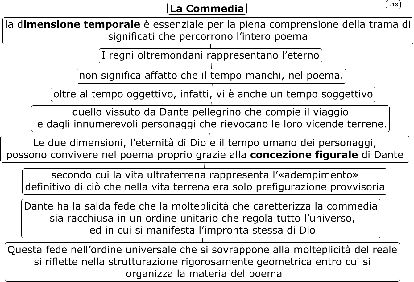 Questa Cmap, creata con IHMC CmapTools, contiene informazioni relative a: 218, I regni oltremondani rappresentano l’eterno ???? non significa affatto che il tempo manchi, nel poema., la dimensione temporale è essenziale per la piena comprensione della trama di significati che percorrono l’intero poema ???? I regni oltremondani rappresentano l’eterno, oltre al tempo oggettivo, infatti, vi è anche un tempo soggettivo ???? quello vissuto da Dante pellegrino che compie il viaggio e dagli innumerevoli personaggi che rievocano le loro vicende terrene., quello vissuto da Dante pellegrino che compie il viaggio e dagli innumerevoli personaggi che rievocano le loro vicende terrene. ???? Le due dimensioni, l’eternità di Dio e il tempo umano dei personaggi, possono convivere nel poema proprio grazie alla concezione figurale di Dante, Le due dimensioni, l’eternità di Dio e il tempo umano dei personaggi, possono convivere nel poema proprio grazie alla concezione figurale di Dante ???? secondo cui la vita ultraterrena rappresenta l’«adempimento» definitivo di ciò che nella vita terrena era solo prefigurazione provvisoria, non significa affatto che il tempo manchi, nel poema. ???? oltre al tempo oggettivo, infatti, vi è anche un tempo soggettivo, Dante ha la salda fede che la molteplicità che caretterizza la commedia sia racchiusa in un ordine unitario che regola tutto l’universo, ed in cui si manifesta l’impronta stessa di Dio ???? Questa fede nell’ordine universale che si sovrappone alla molteplicità del reale si riflette nella strutturazione rigorosamente geometrica entro cui si organizza la materia del poema, La Commedia ???? la dimensione temporale è essenziale per la piena comprensione della trama di significati che percorrono l’intero poema